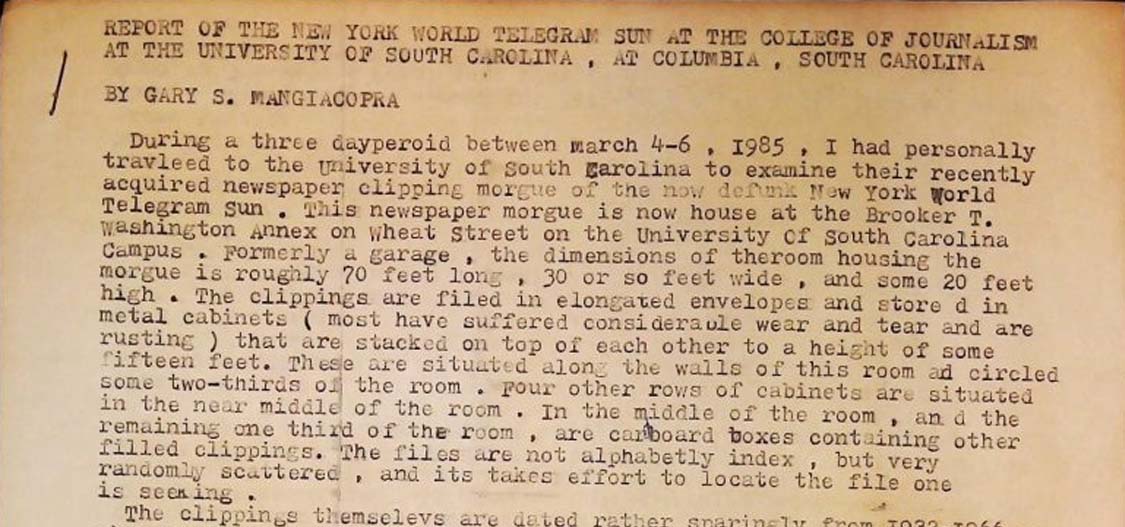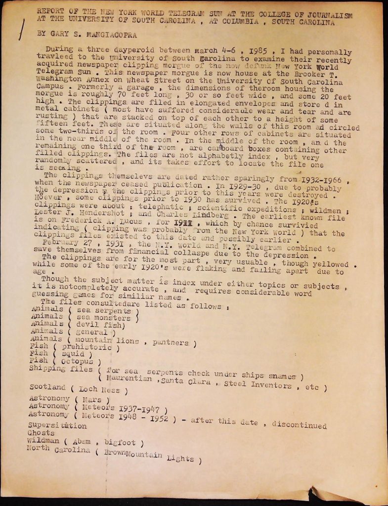 Uncategorized B1F14I4 Box 1 Folder 14: Historical References Item 4: Report of the New York World Telegram by Gary Mangiacopra