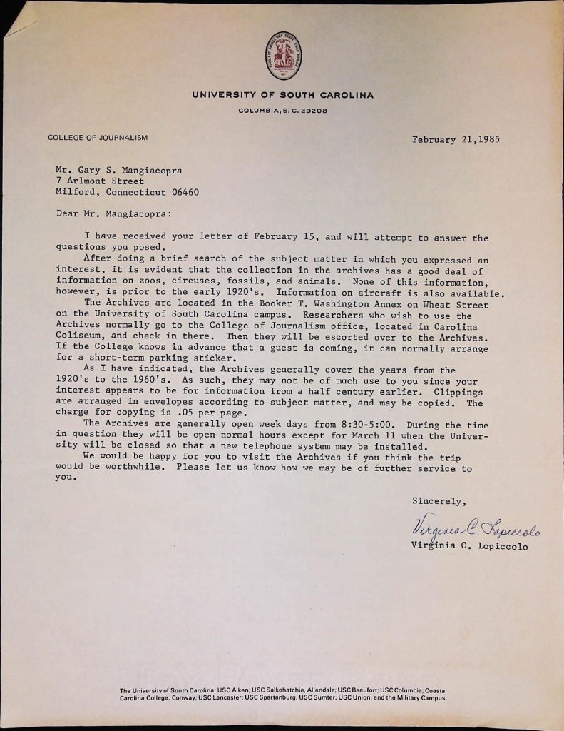 Uncategorized B1F5I4 Box 1 Folder 5: New Newspaper and Archive Industry Item 4: Letter from Virginia C. Lopiccolo to Gary Mangiacopra