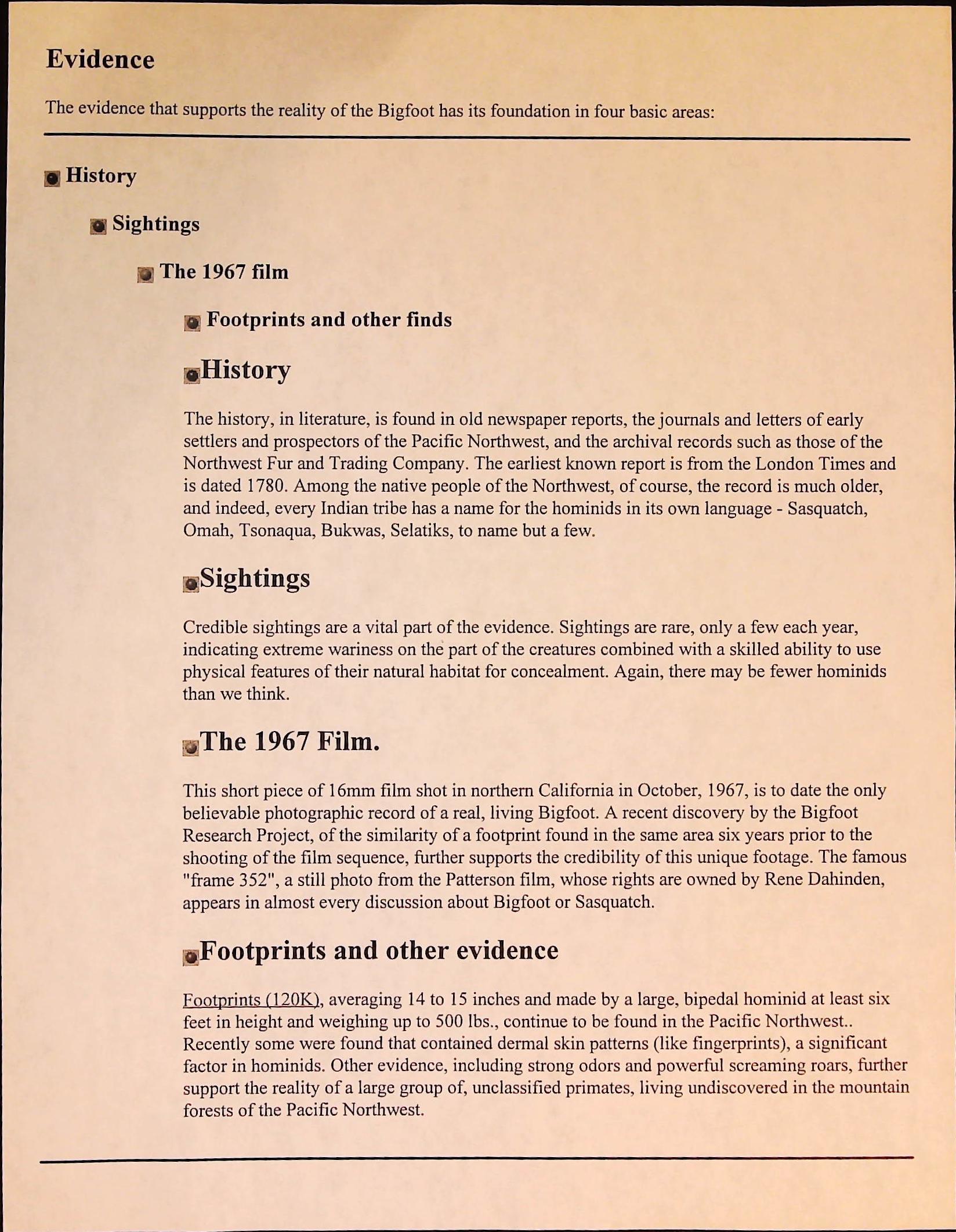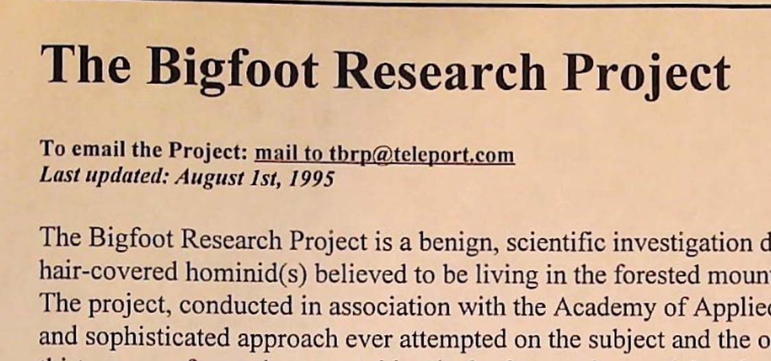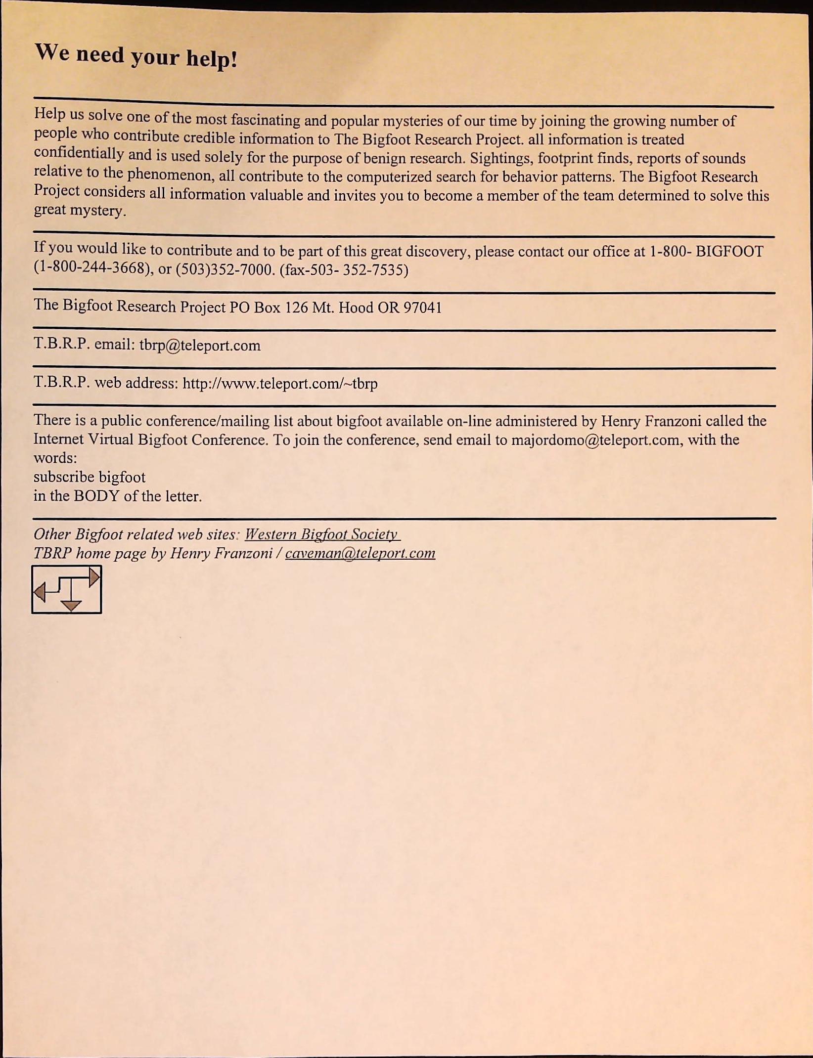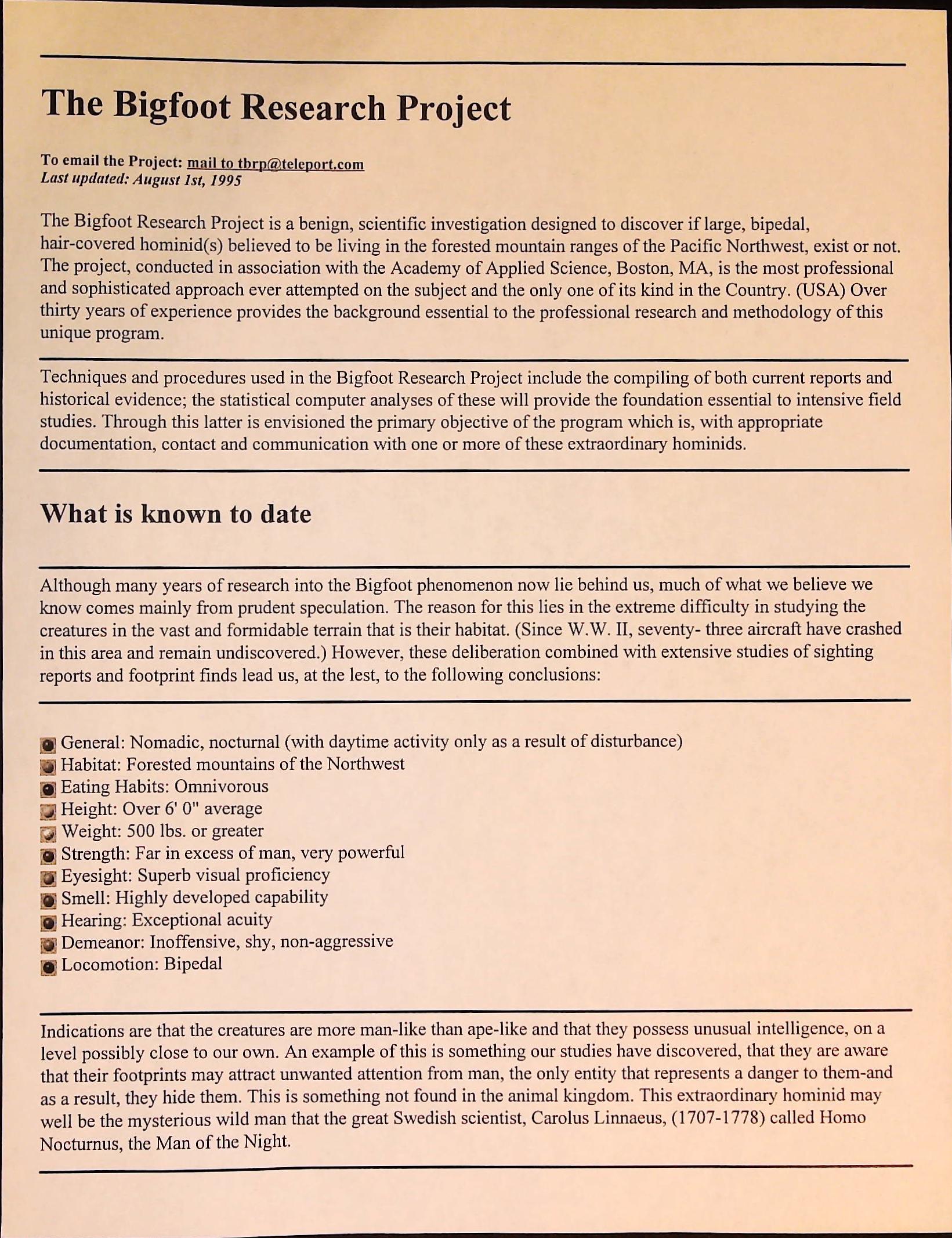 Cryptozoology - Wildmen B3F1I18 Box 3 Folder 1. Internet Cryptozoology Reports Item 18. Bigfoot Research Project