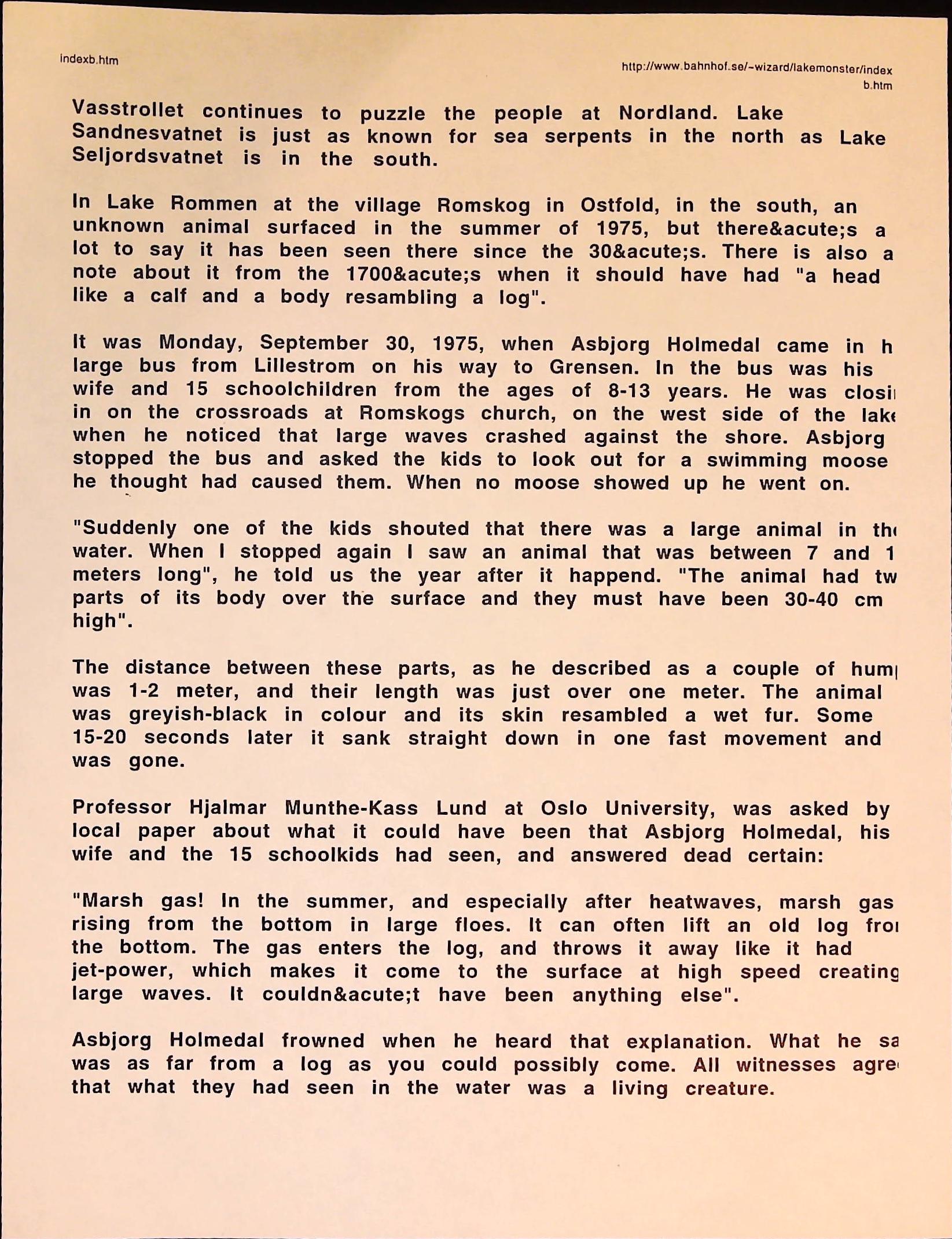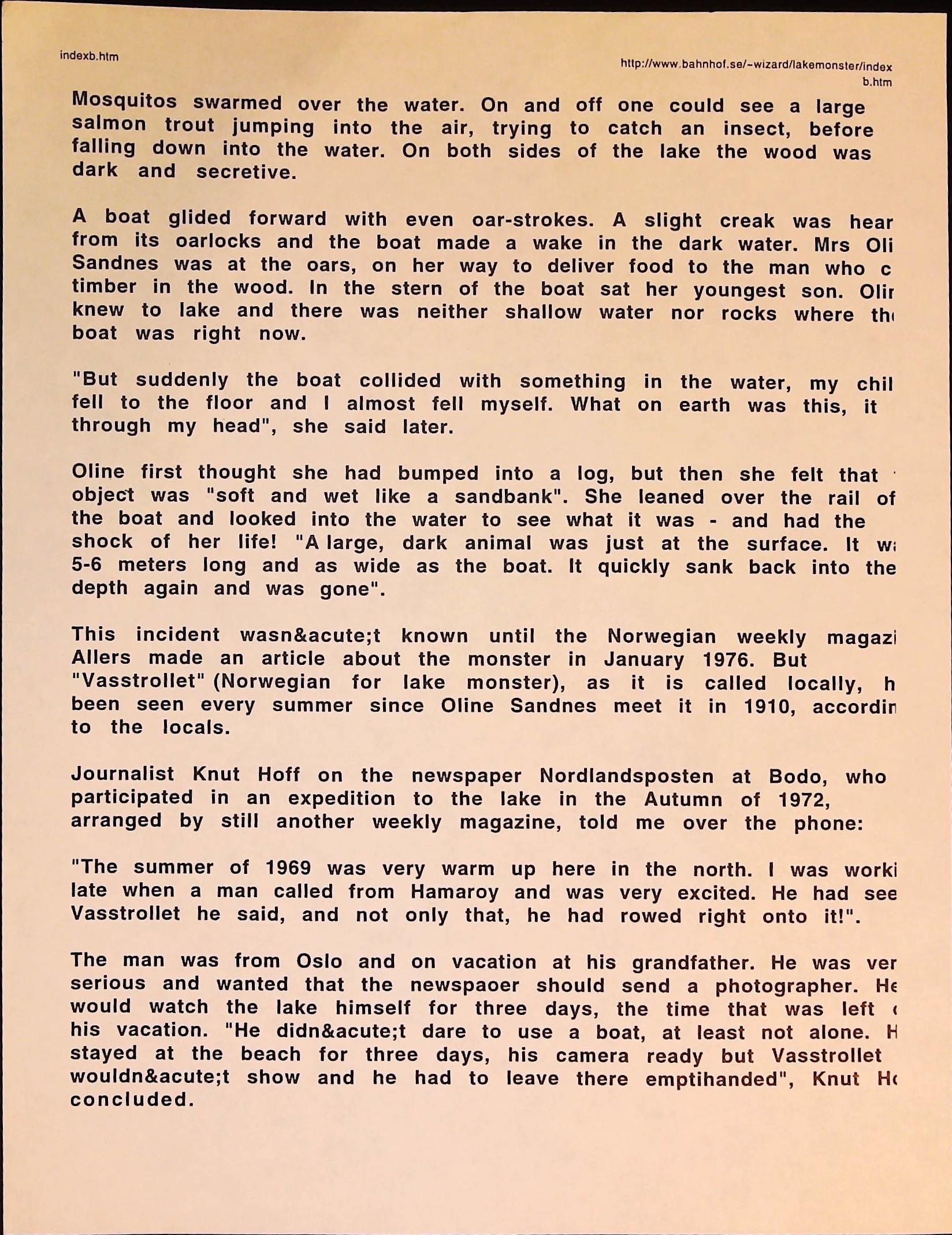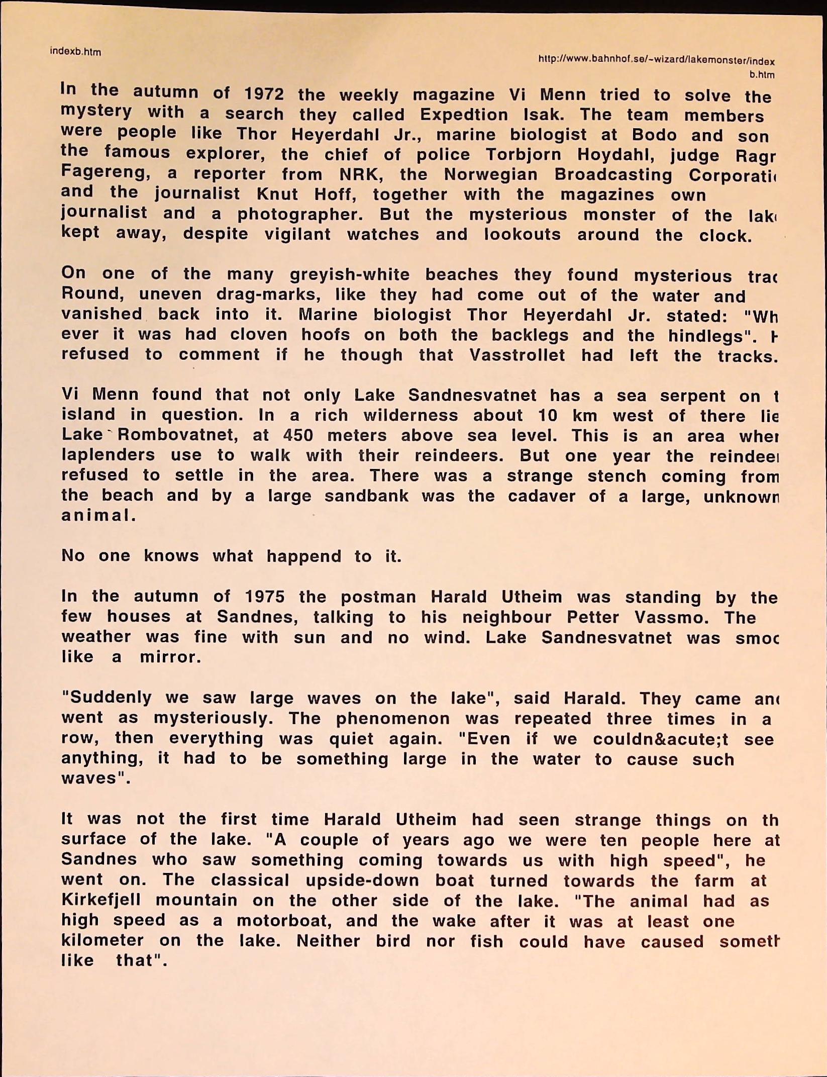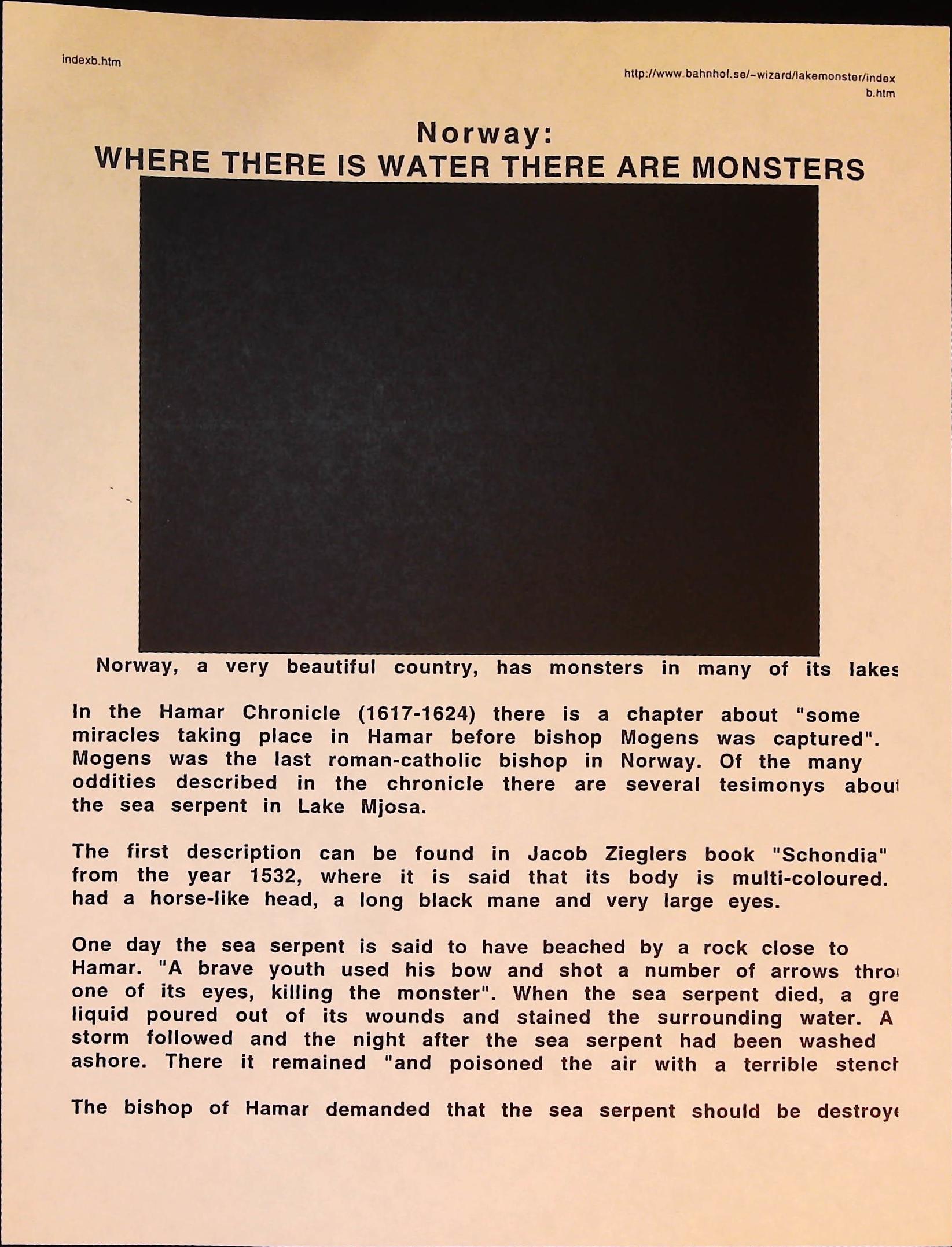 Cryptozoology B3F3I14 Box 3 Folder 3. Internet Crypto Newsletter Item 14. Norway – Where There is Water There Are Monsters