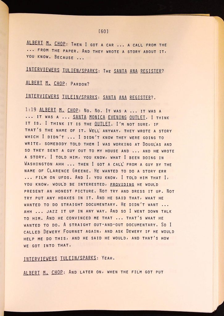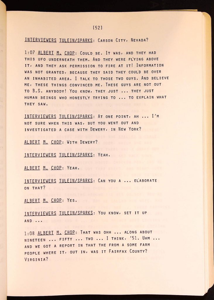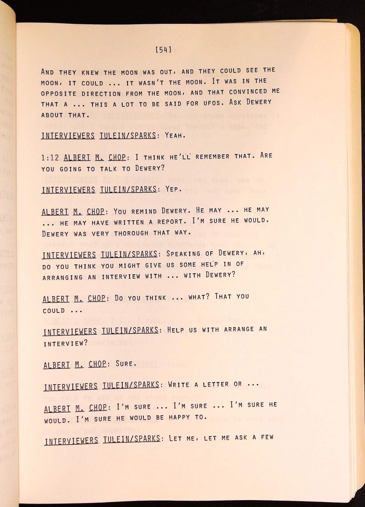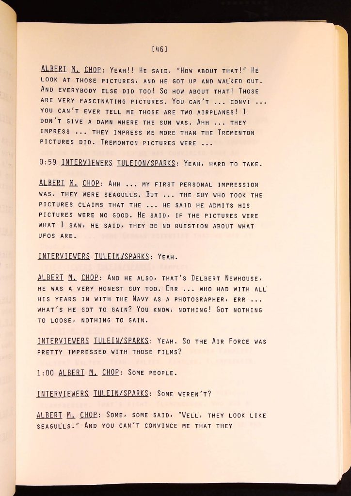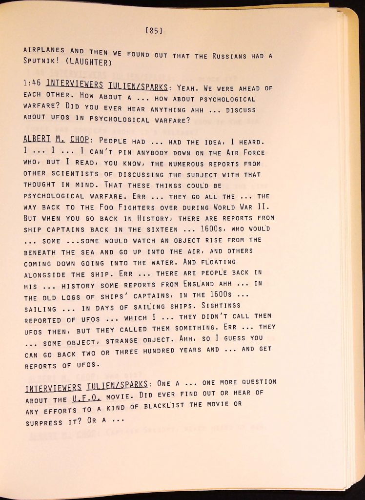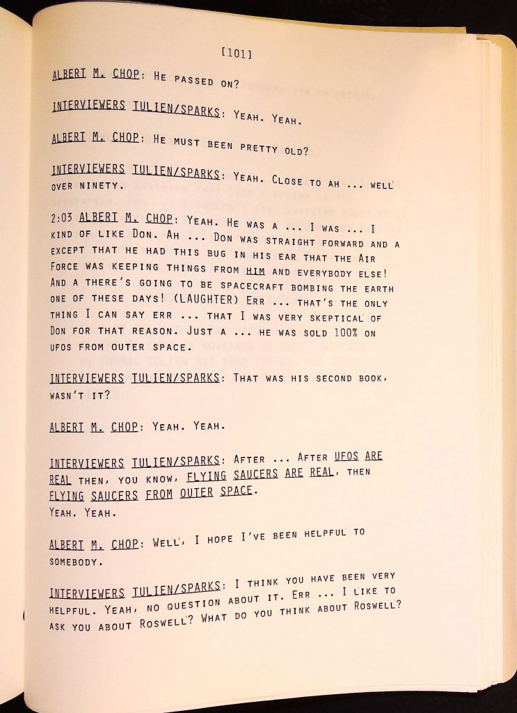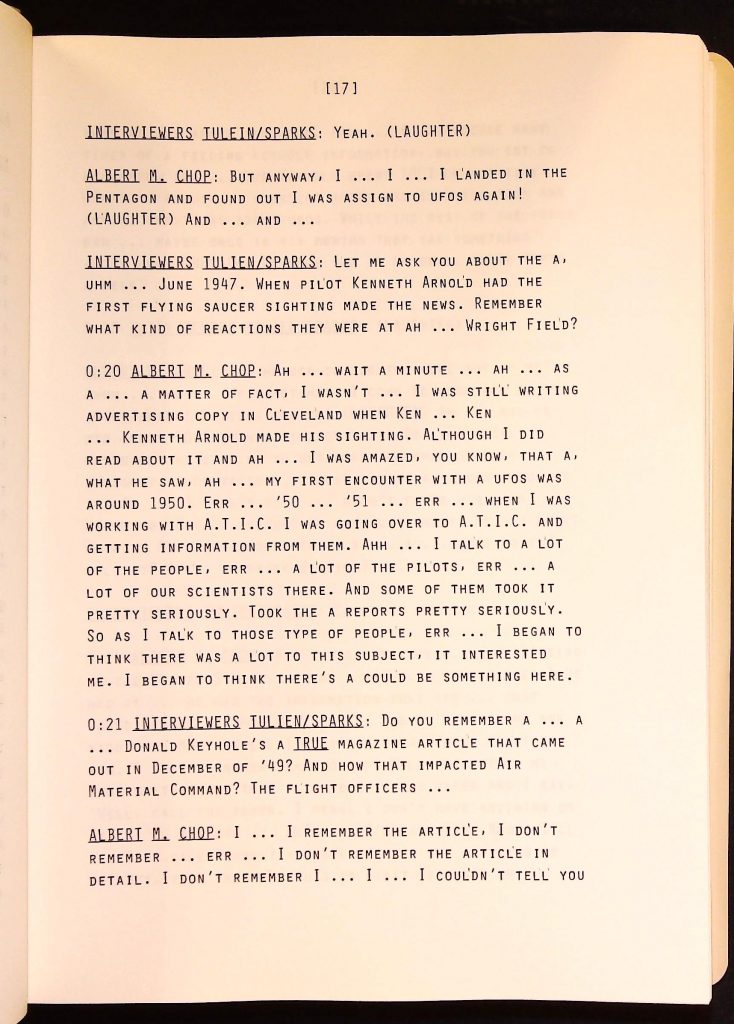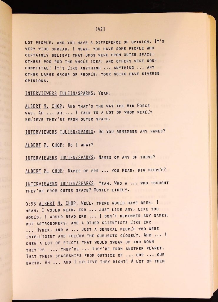 UFOs B4F1I1 Box 4 Folder 1. UFO Interview and Documentary Transcripts Item 1. Transcript of Video Interview with Albert M. Chop 1999