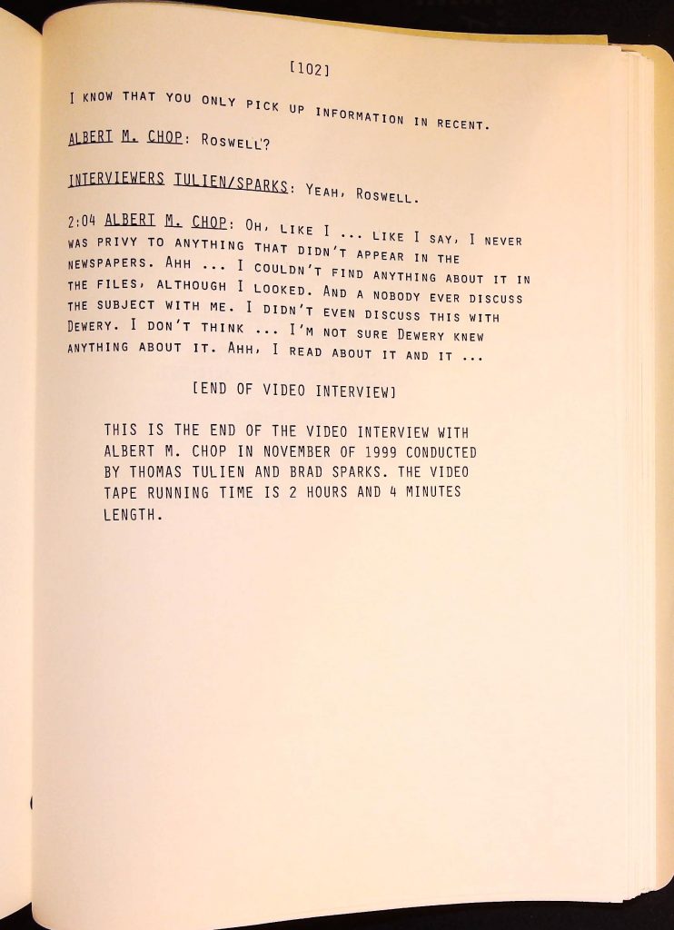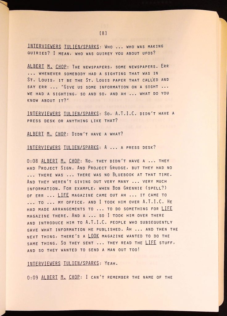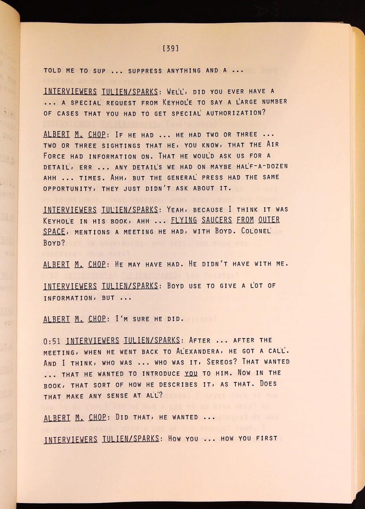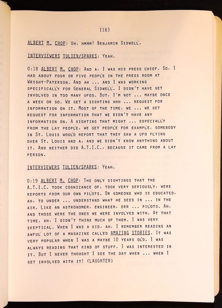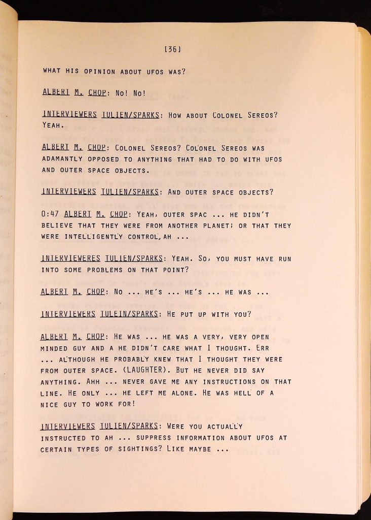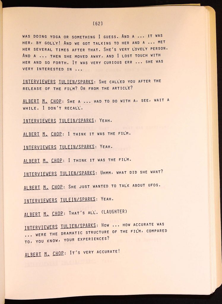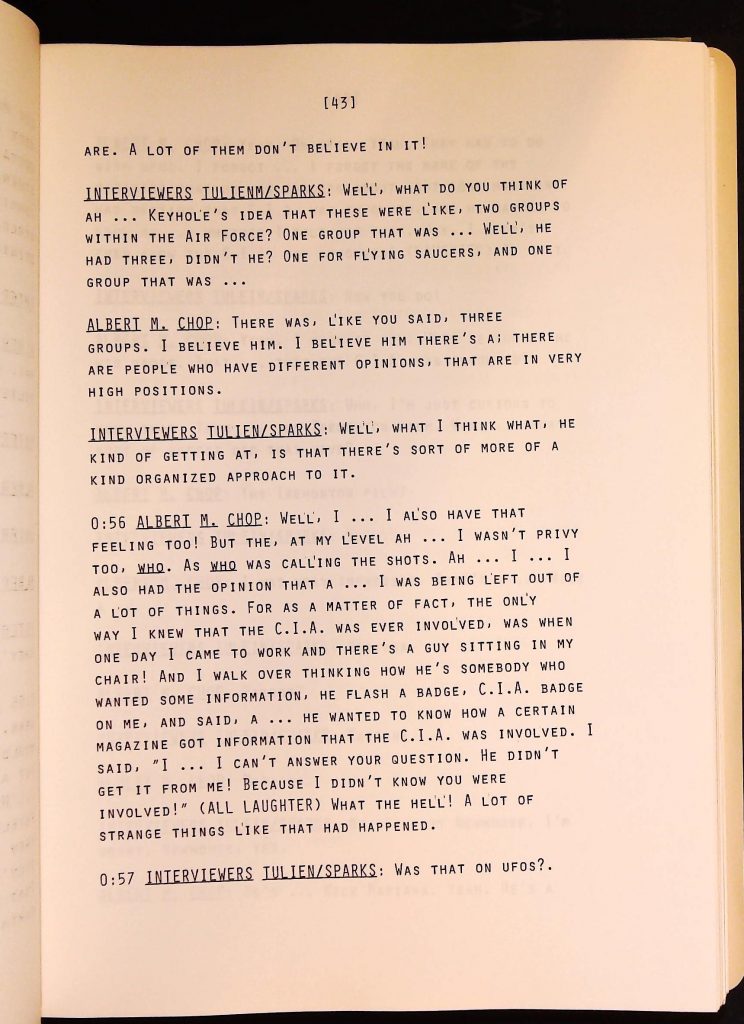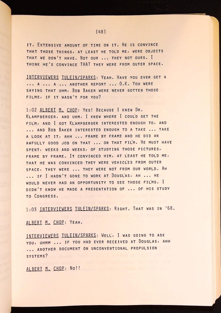 UFOs B4F1I1 Box 4 Folder 1. UFO Interview and Documentary Transcripts Item 1. Transcript of Video Interview with Albert M. Chop 1999