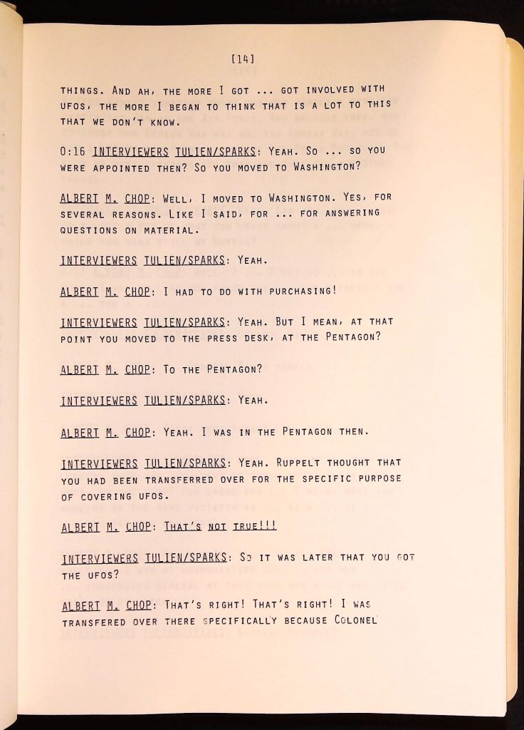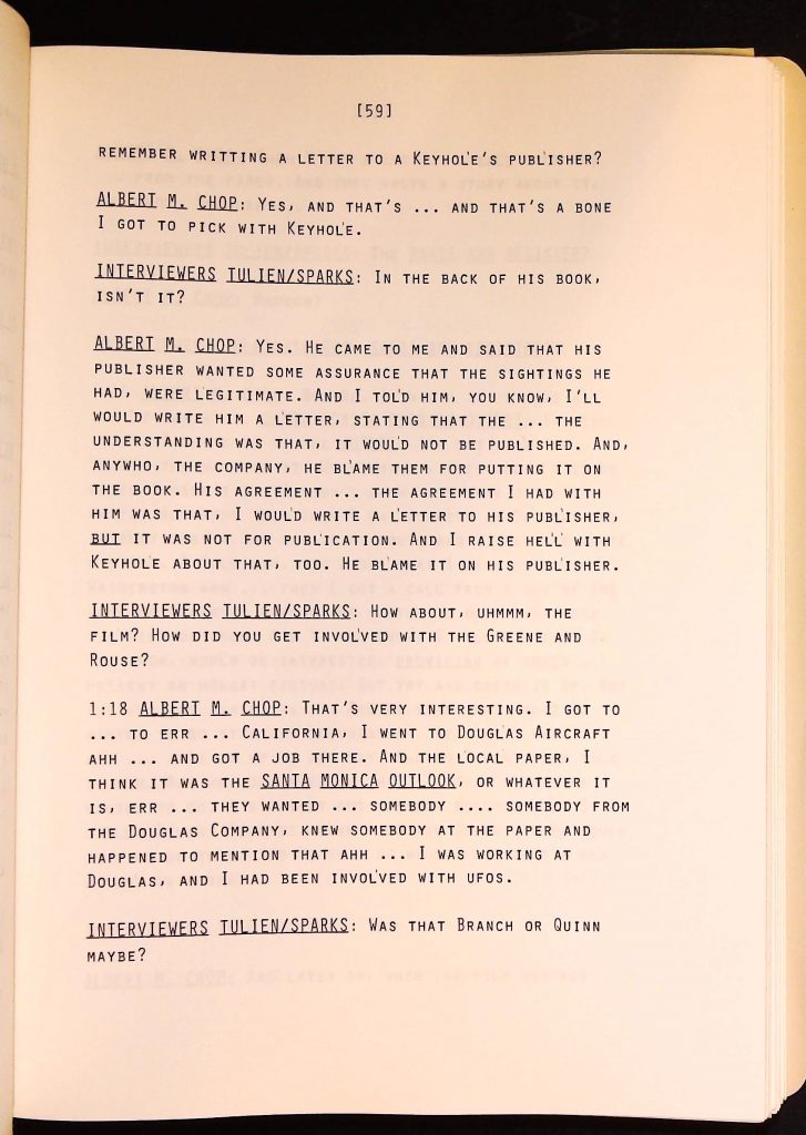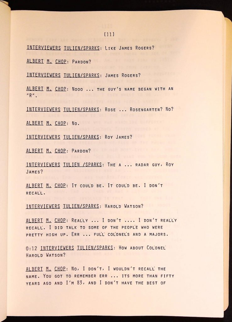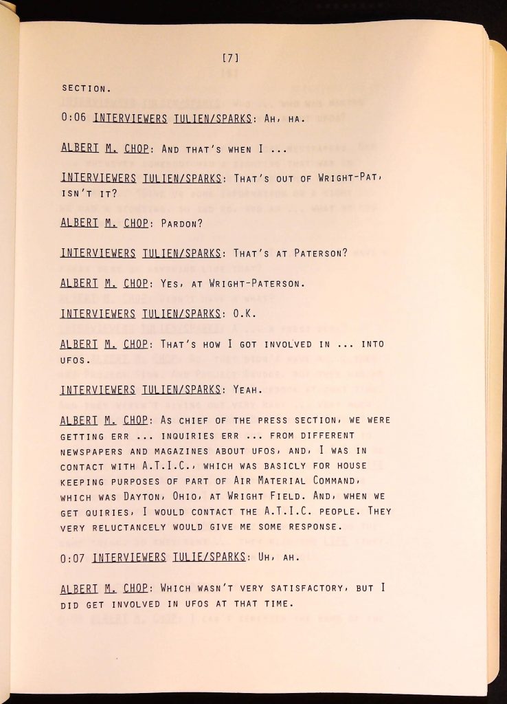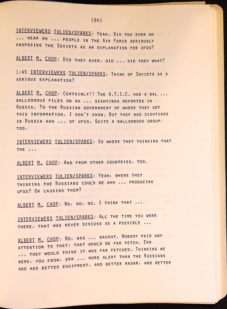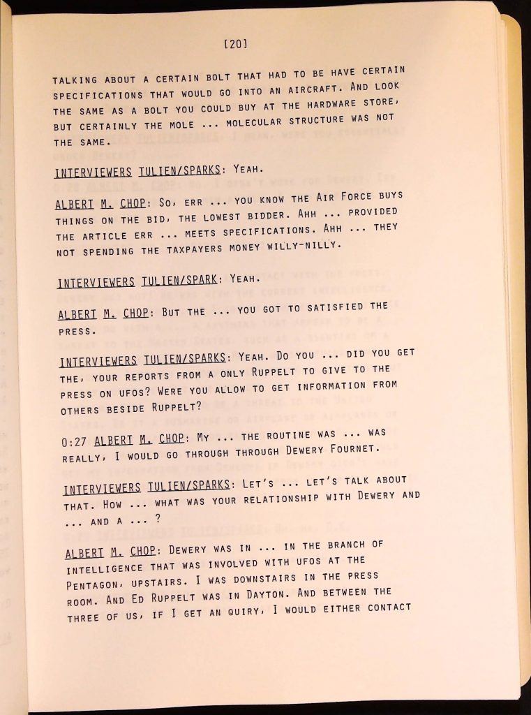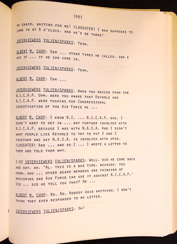 UFOs B4F1I1 Box 4 Folder 1. UFO Interview and Documentary Transcripts Item 1. Transcript of Video Interview with Albert M. Chop 1999