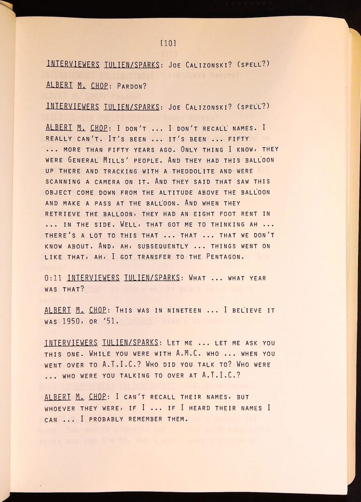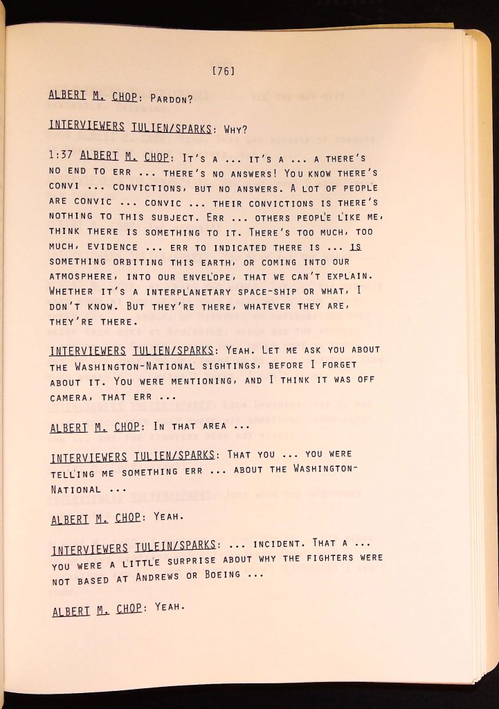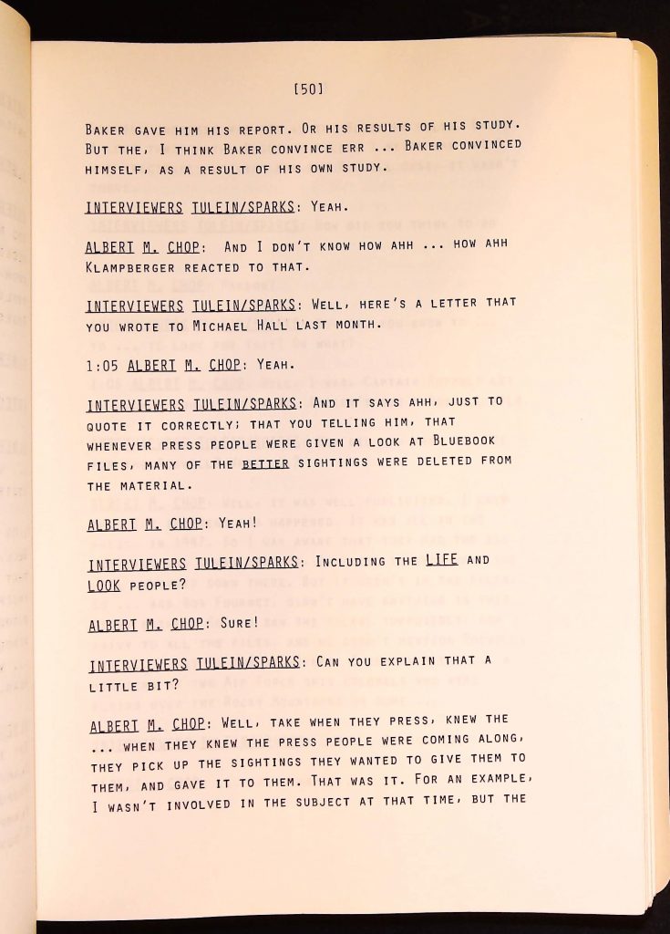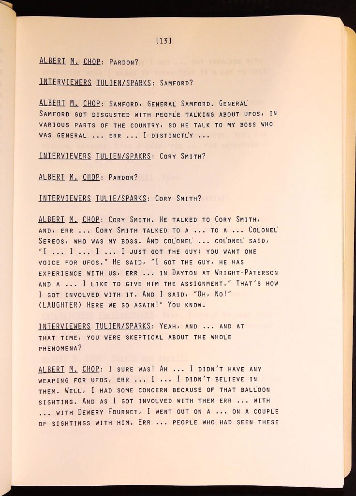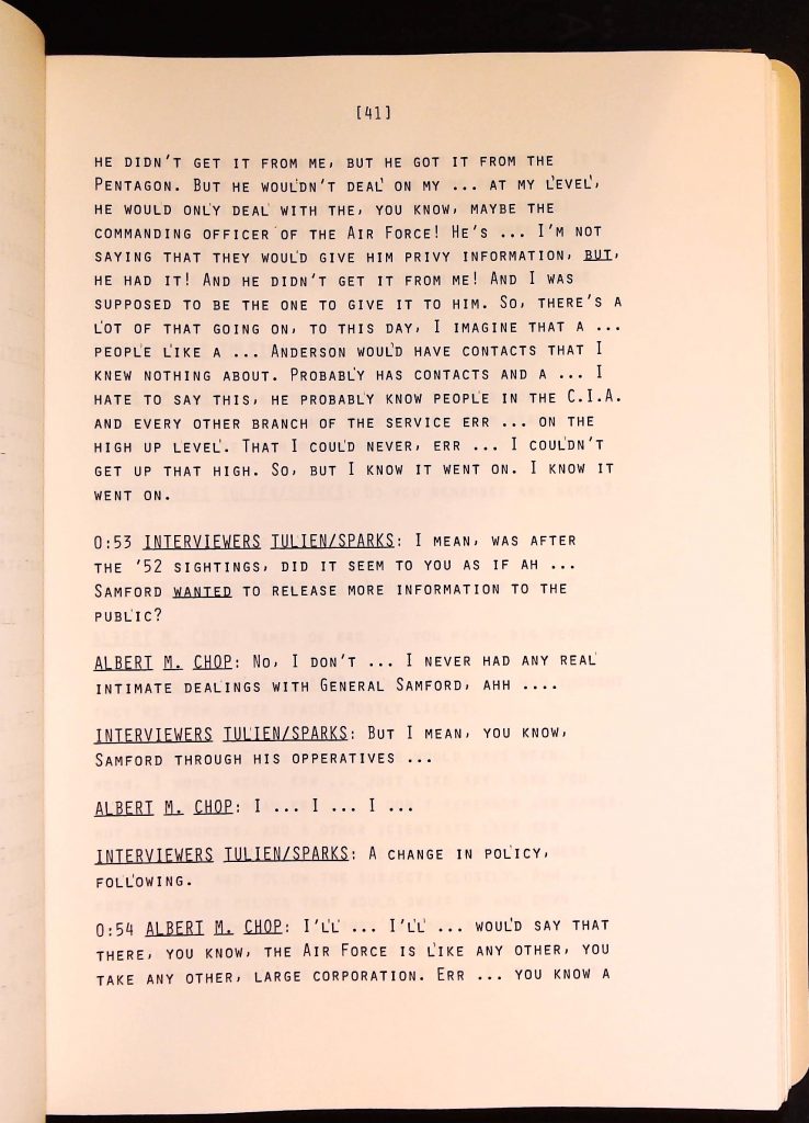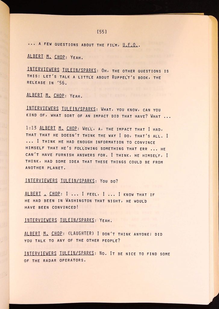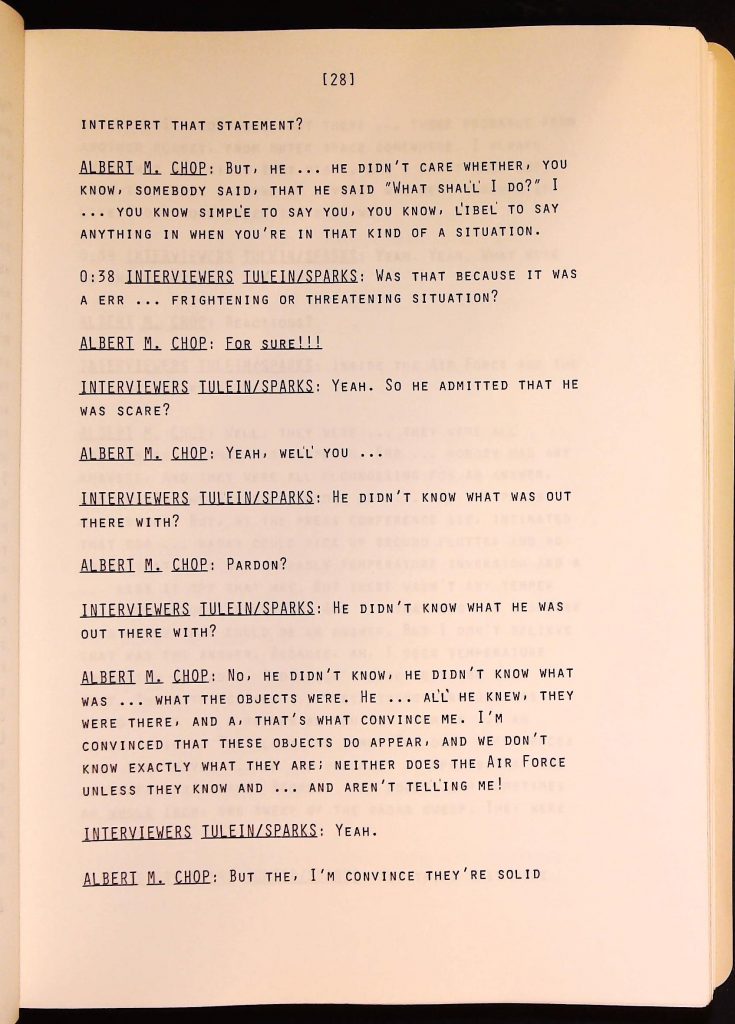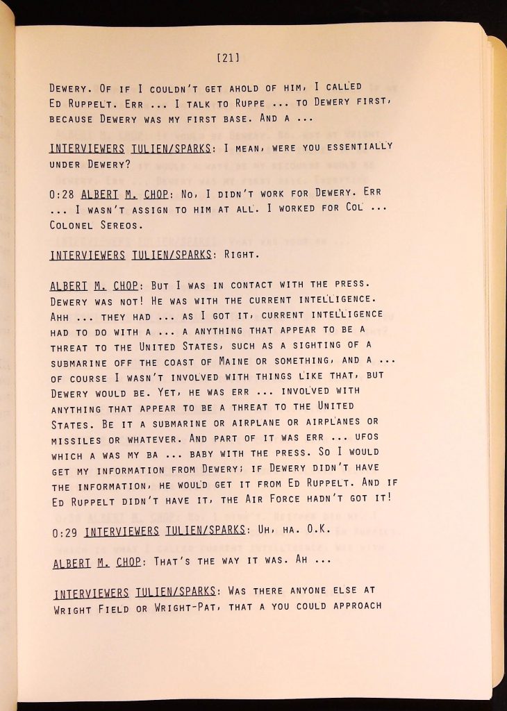 UFOs B4F1I1 Box 4 Folder 1. UFO Interview and Documentary Transcripts Item 1. Transcript of Video Interview with Albert M. Chop 1999