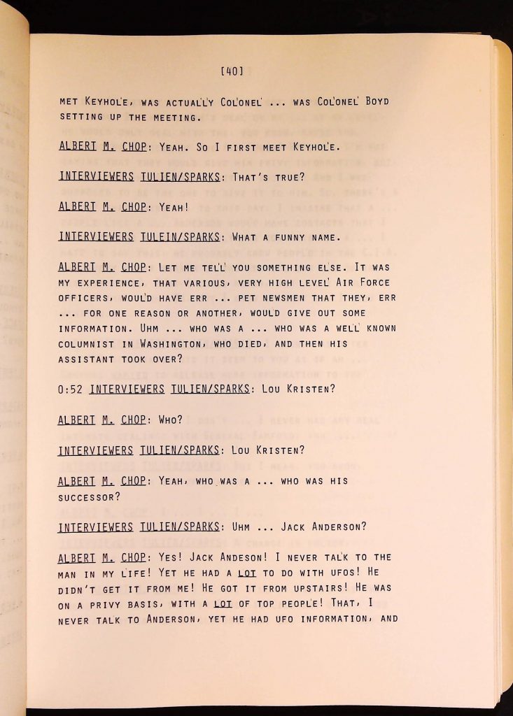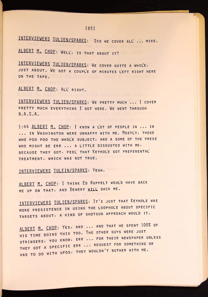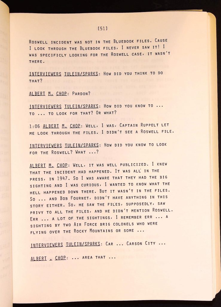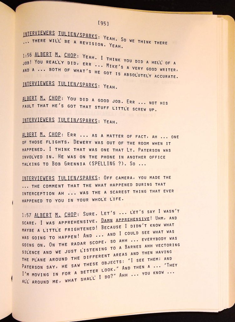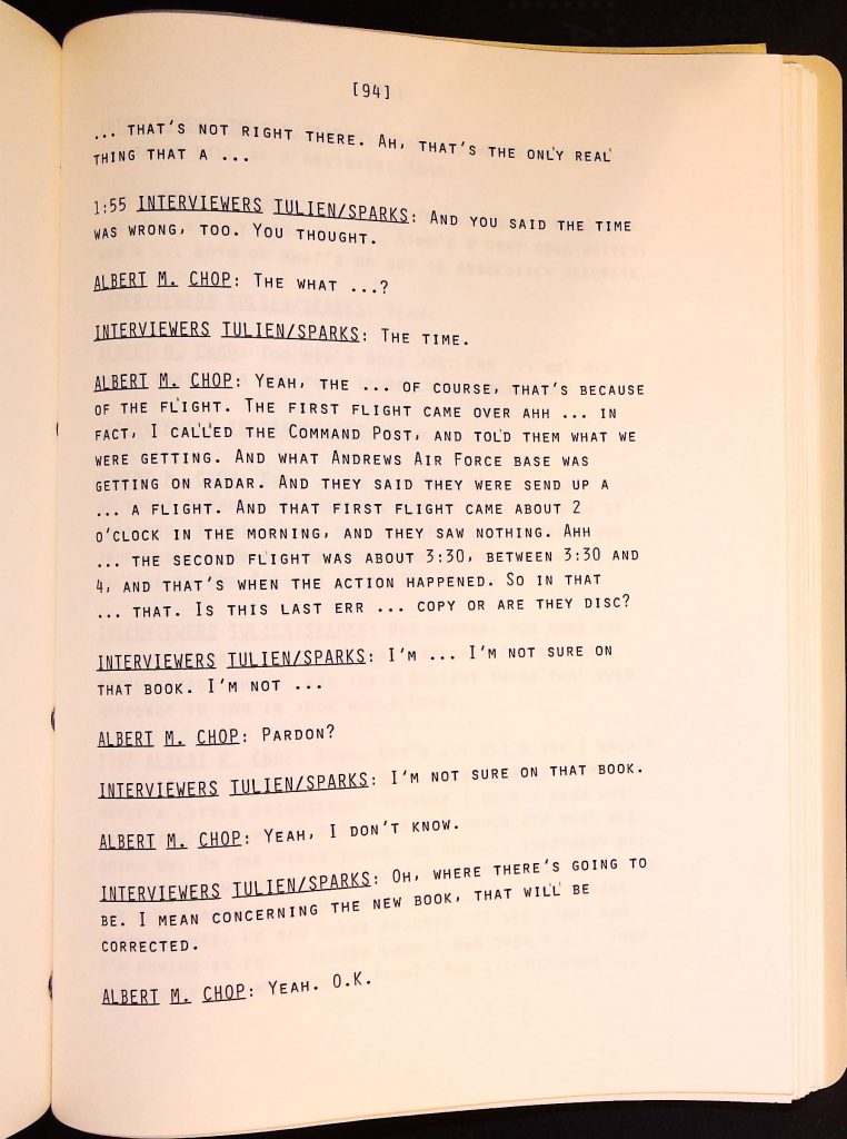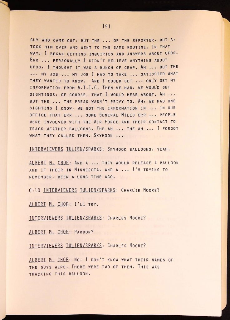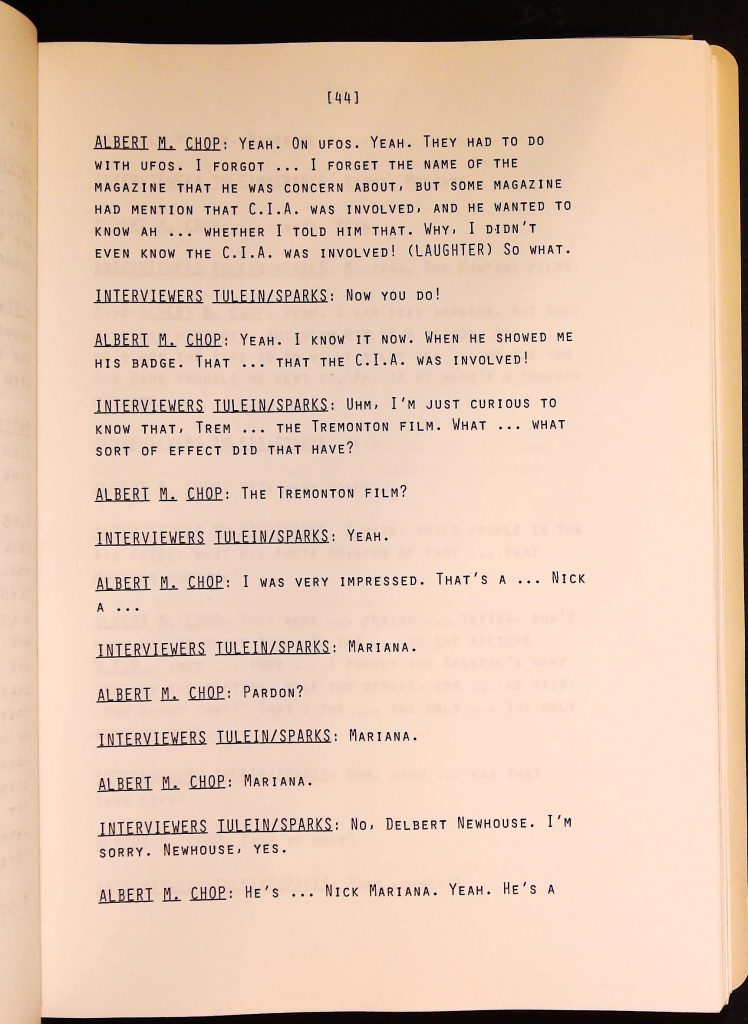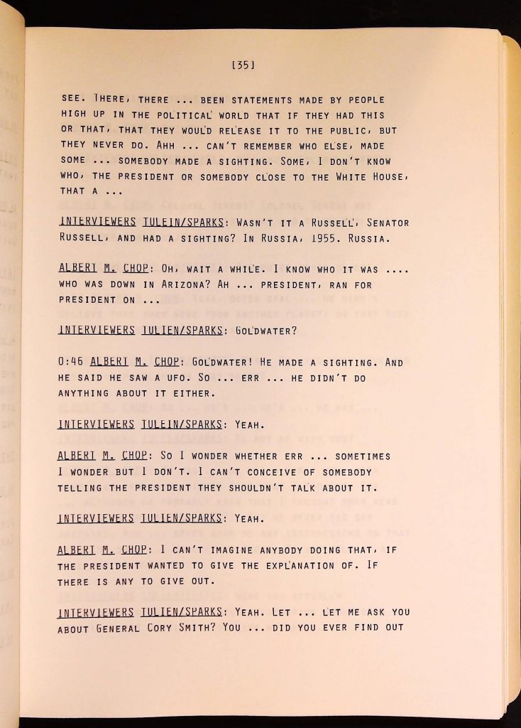 UFOs B4F1I1 Box 4 Folder 1. UFO Interview and Documentary Transcripts Item 1. Transcript of Video Interview with Albert M. Chop 1999