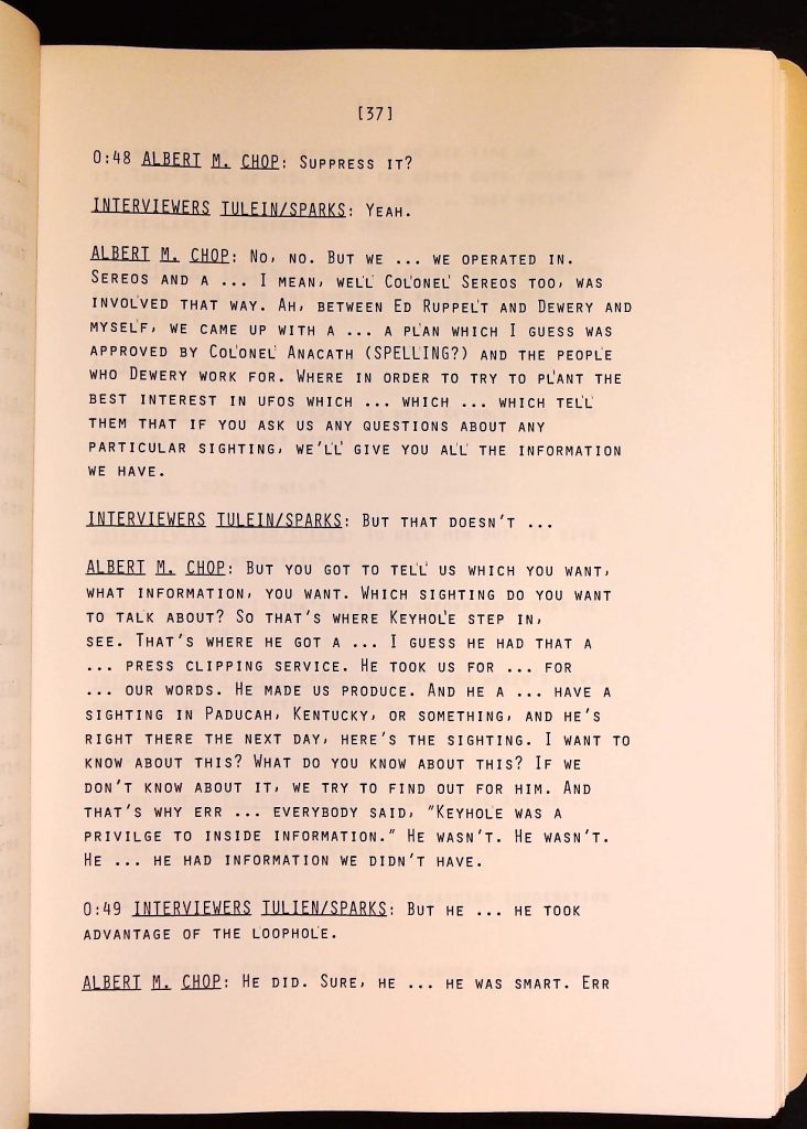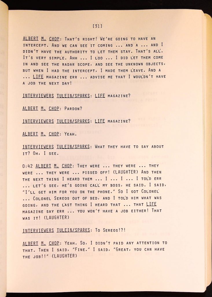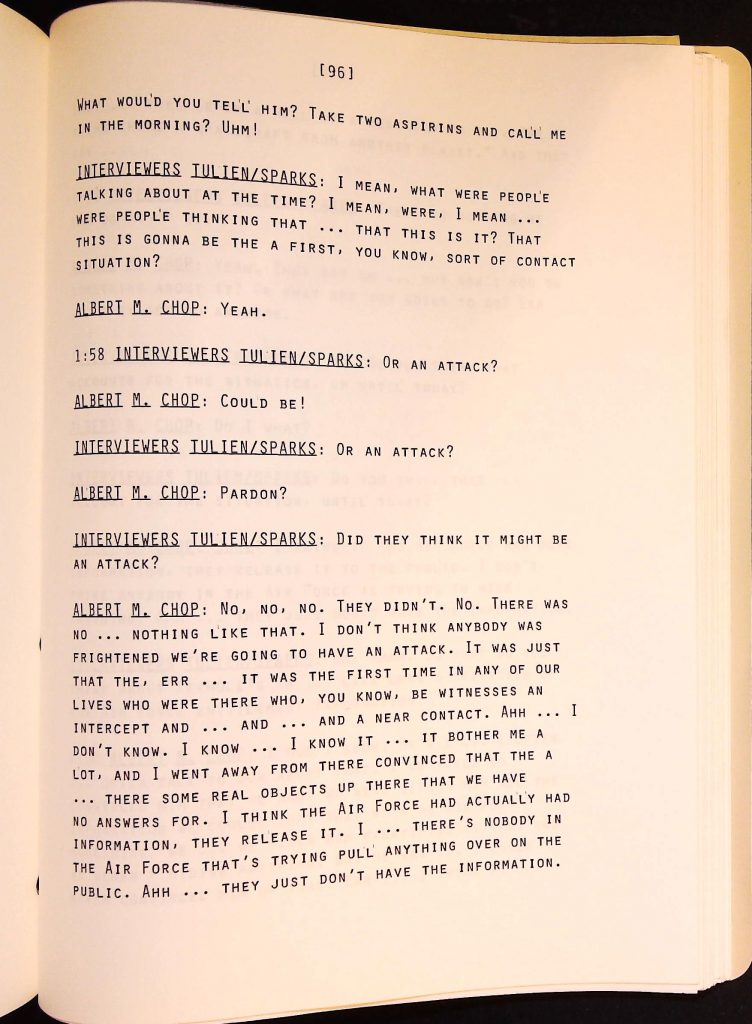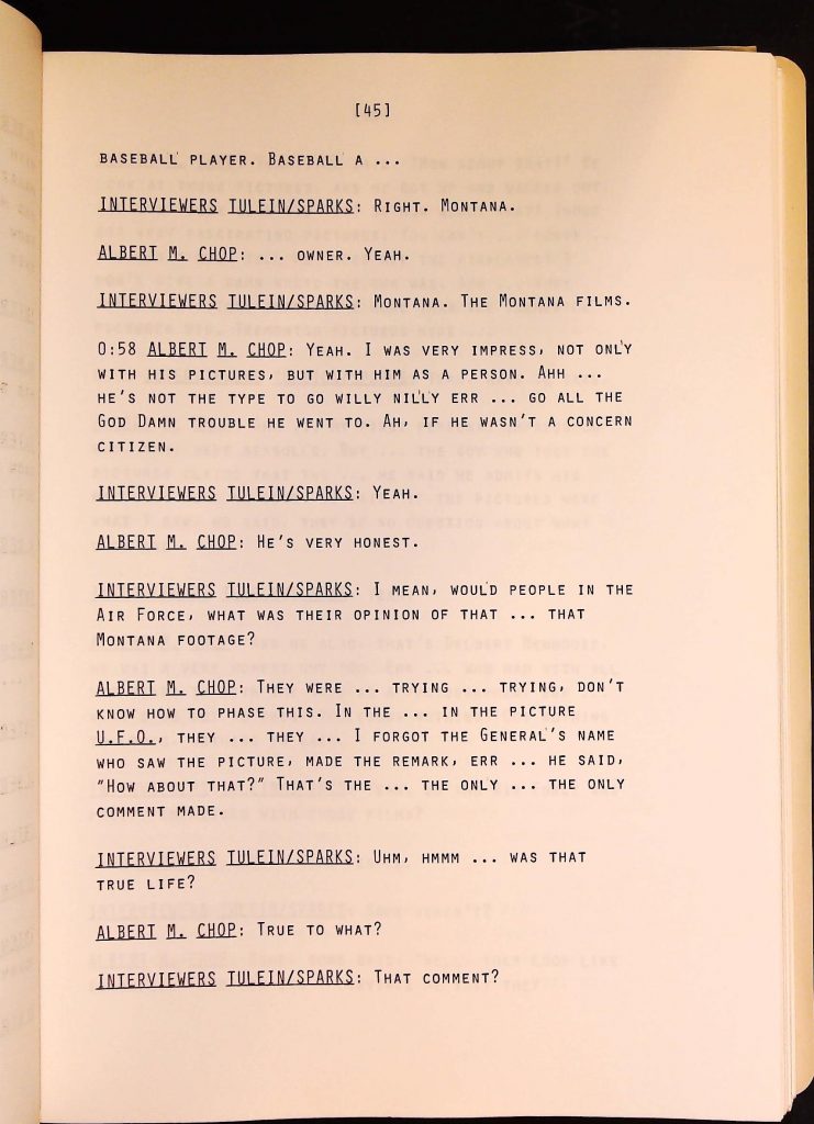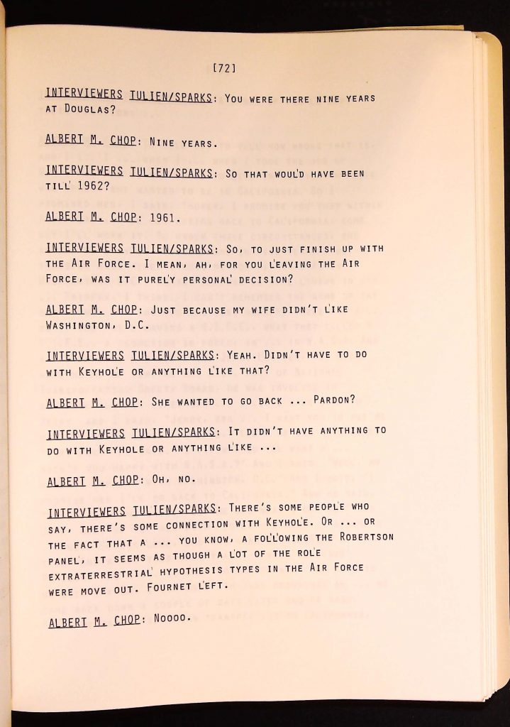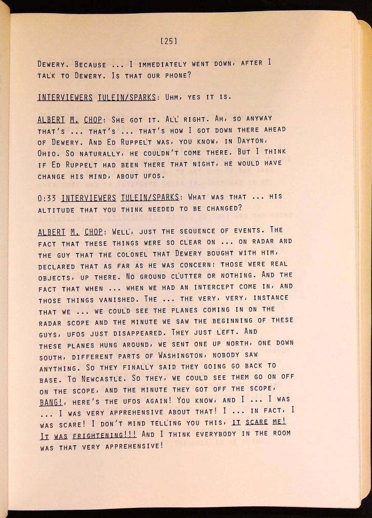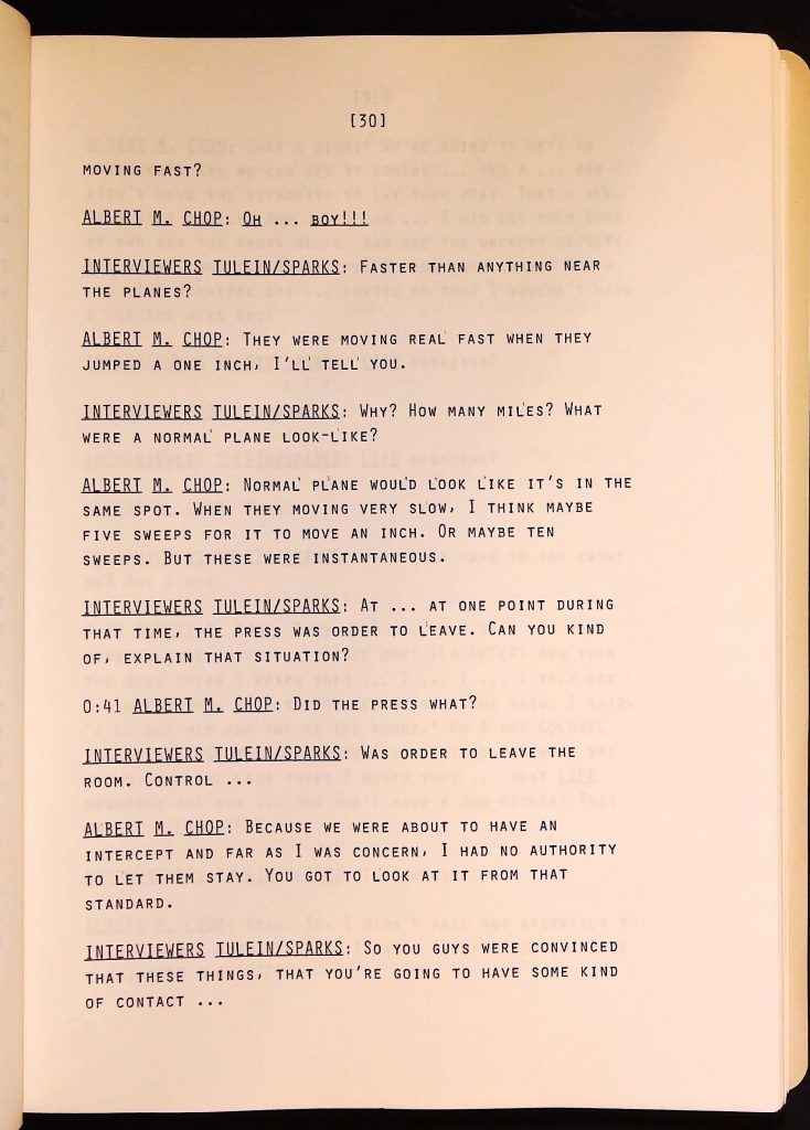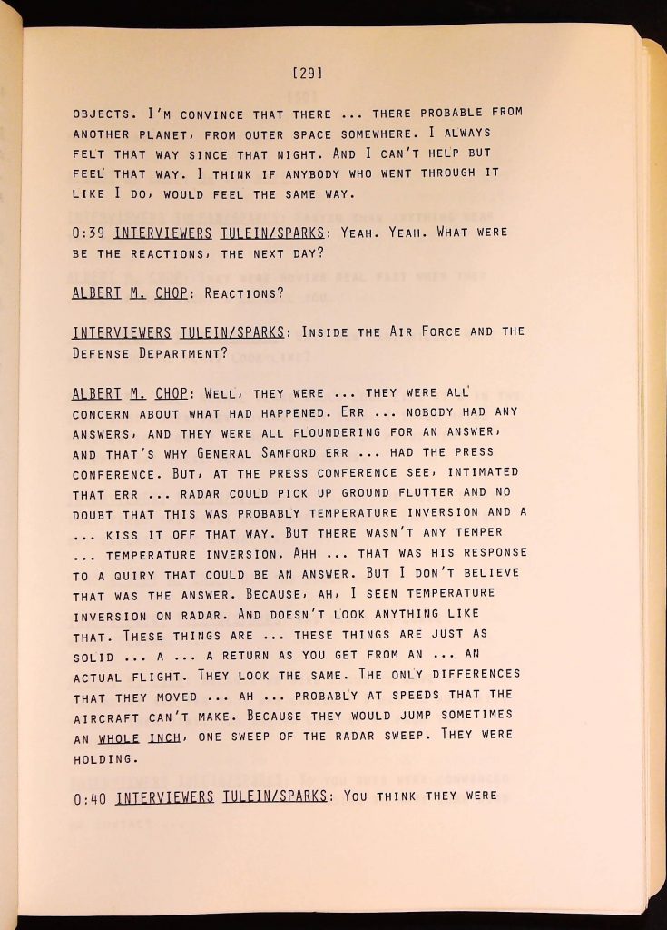 UFOs B4F1I1 Box 4 Folder 1. UFO Interview and Documentary Transcripts Item 1. Transcript of Video Interview with Albert M. Chop 1999