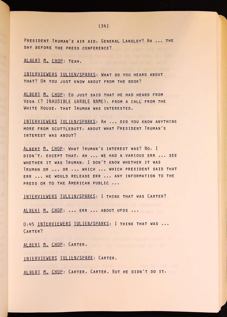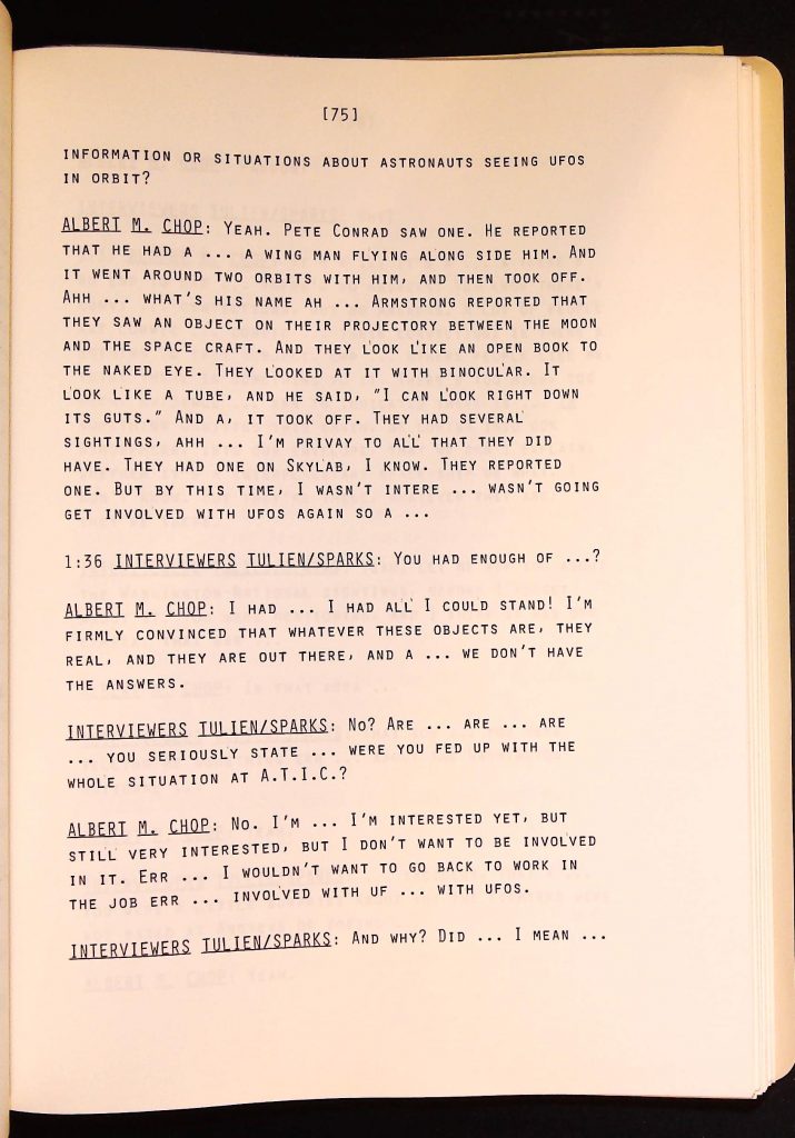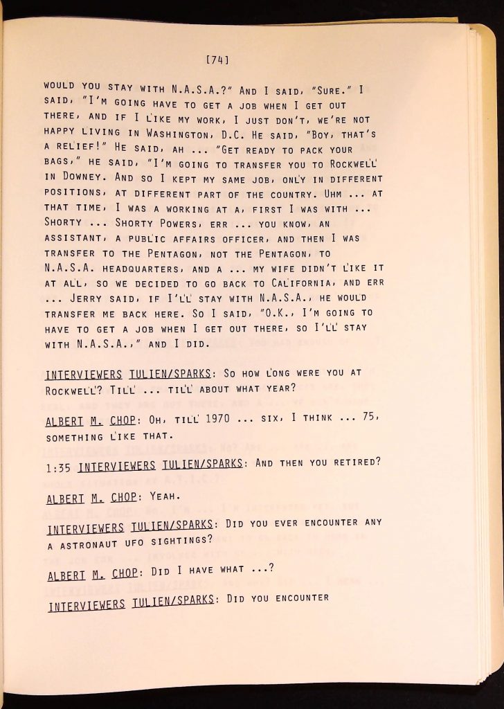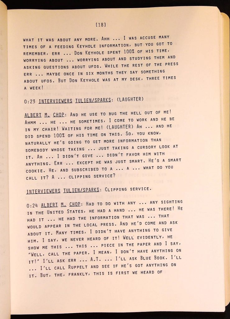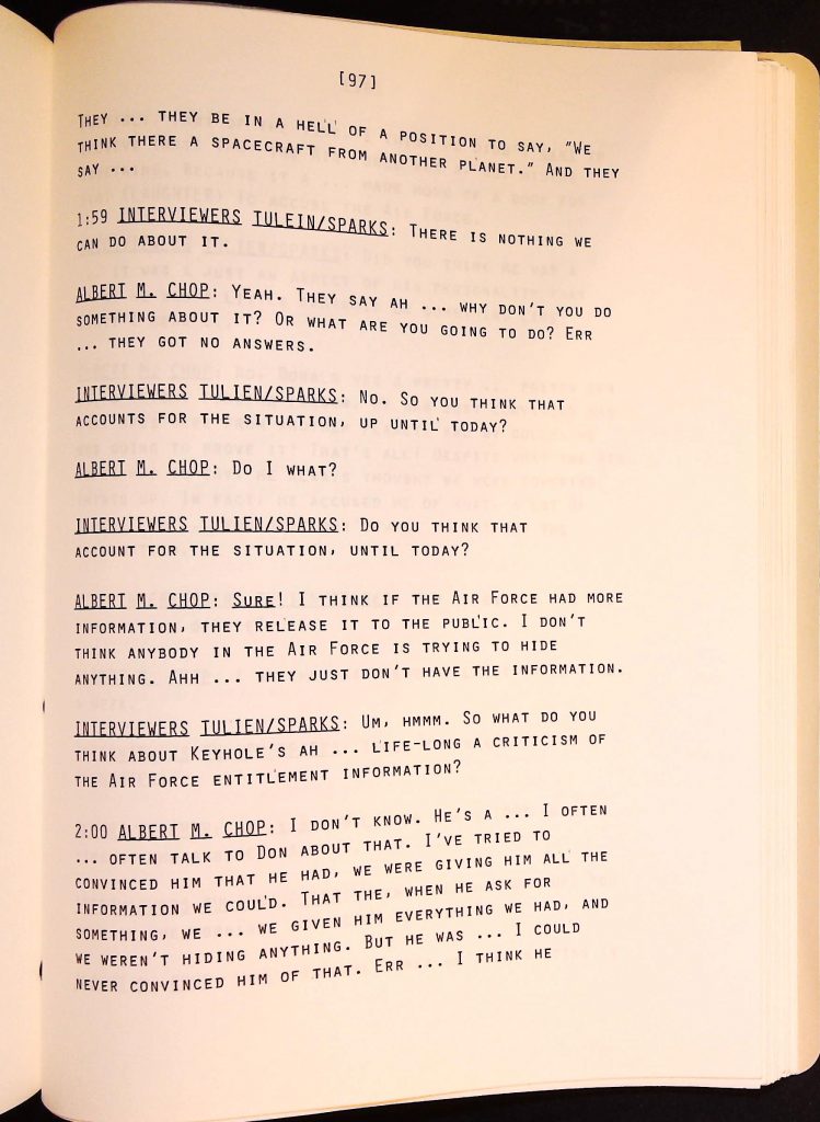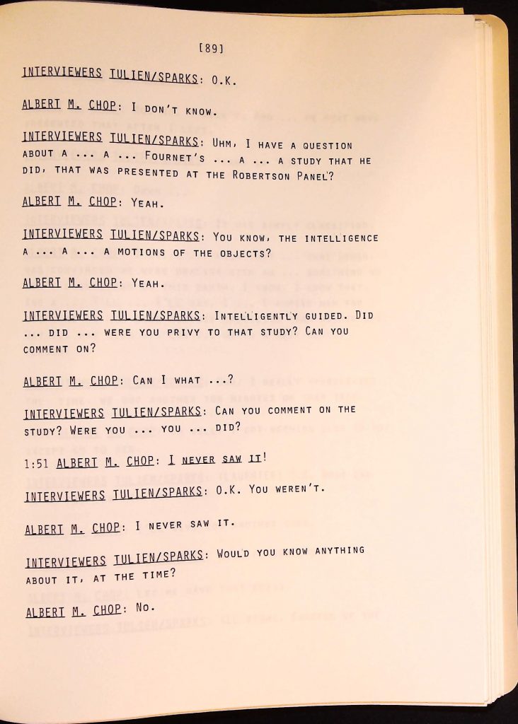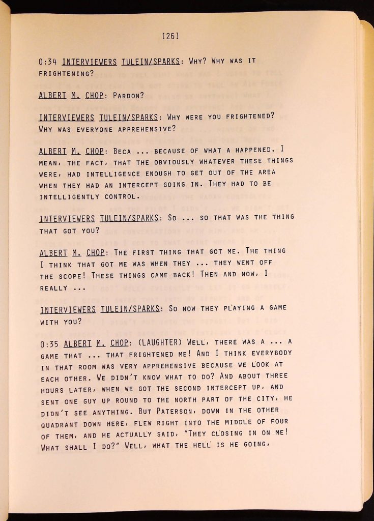 UFOs B4F1I1 Box 4 Folder 1. UFO Interview and Documentary Transcripts Item 1. Transcript of Video Interview with Albert M. Chop 1999