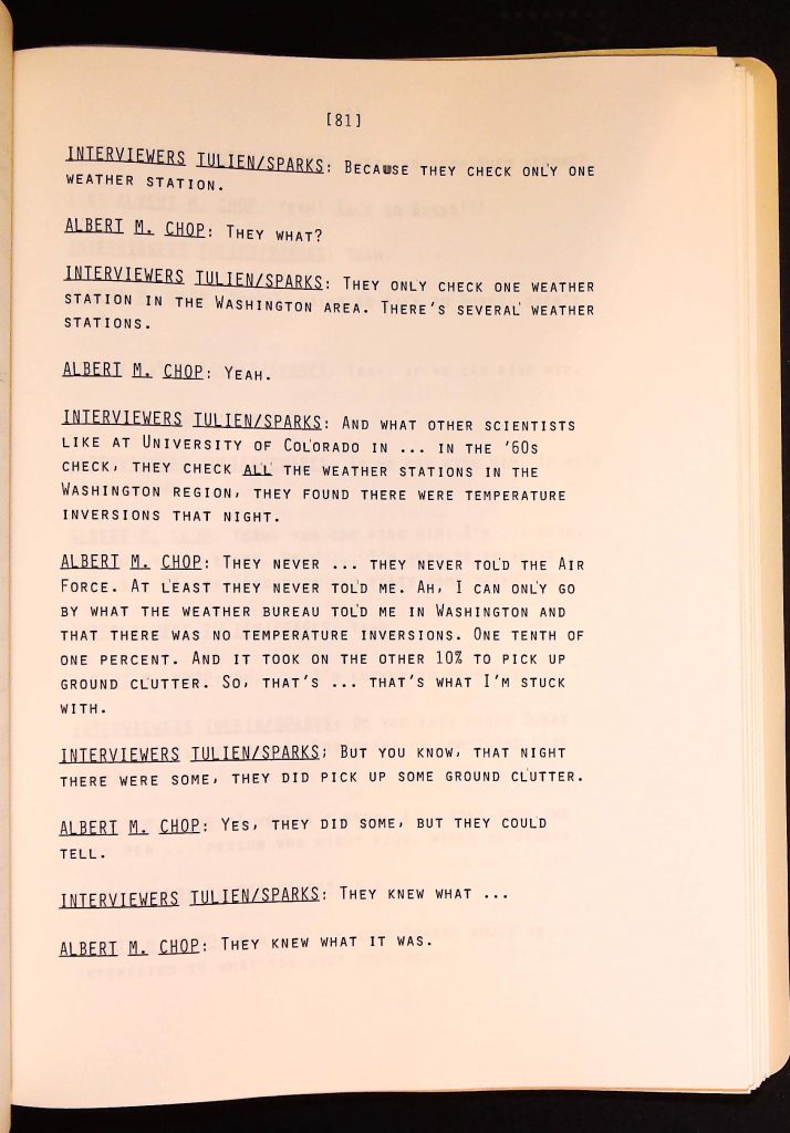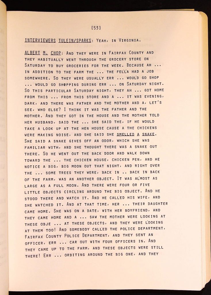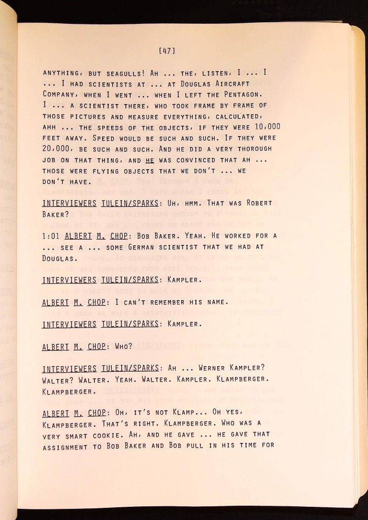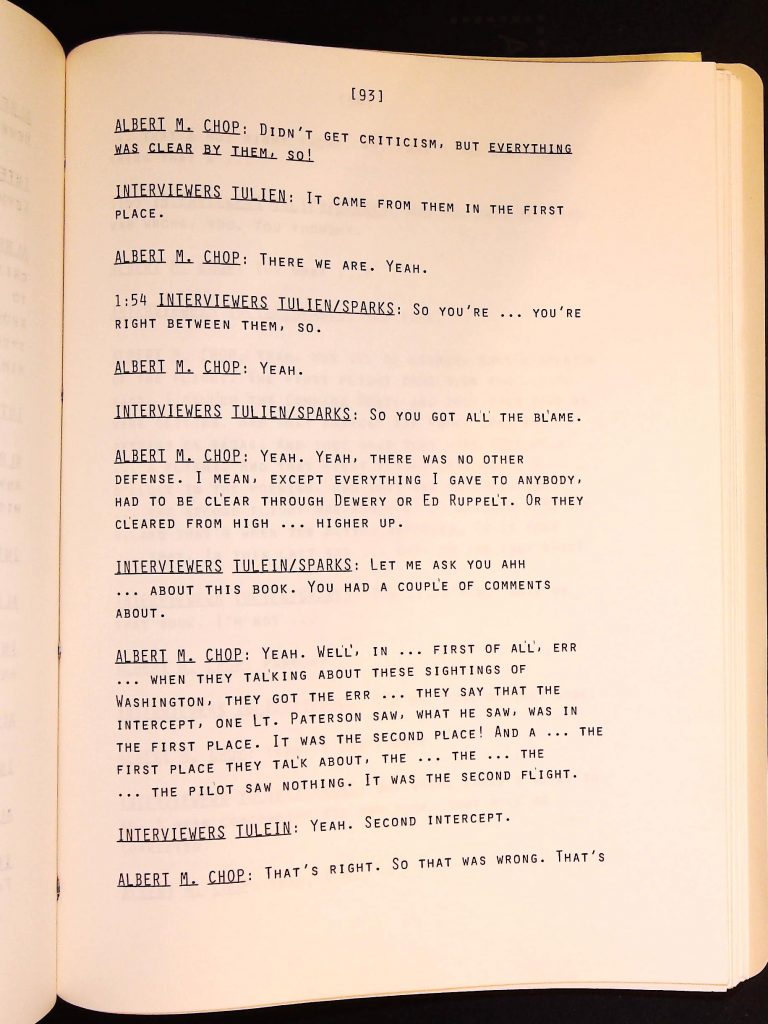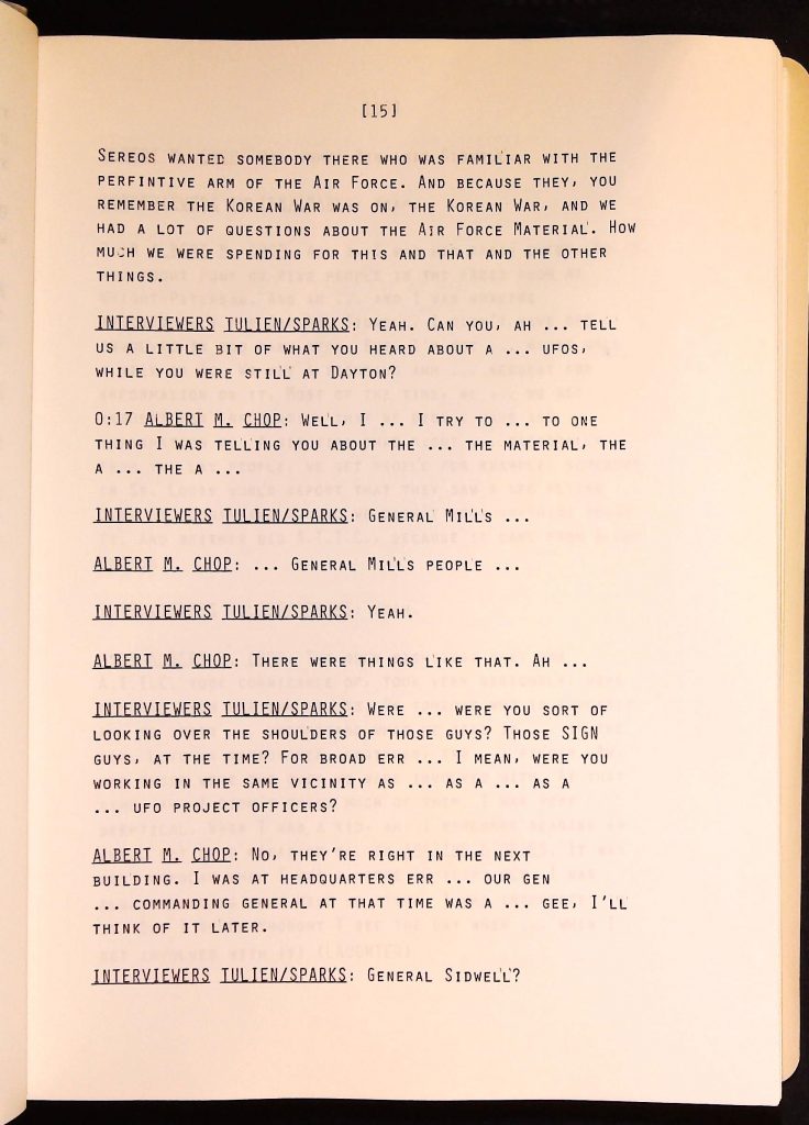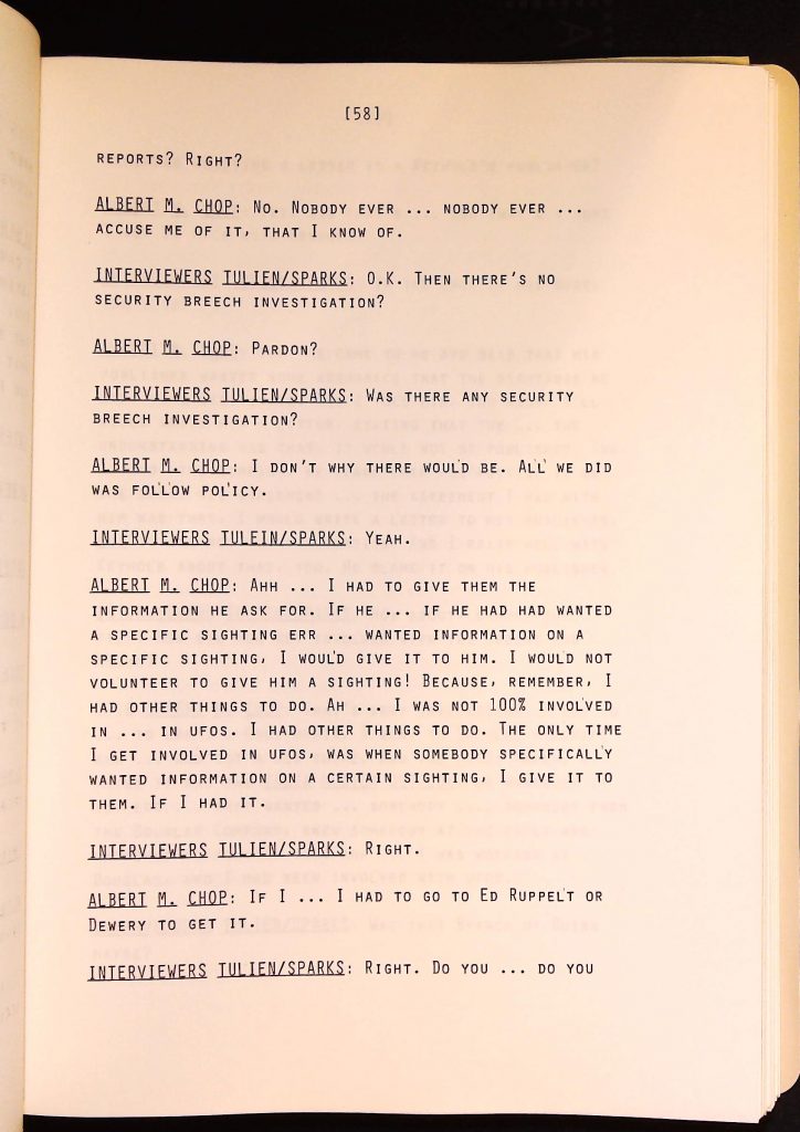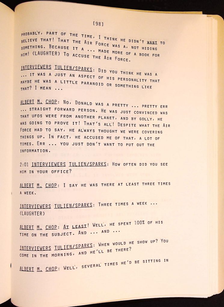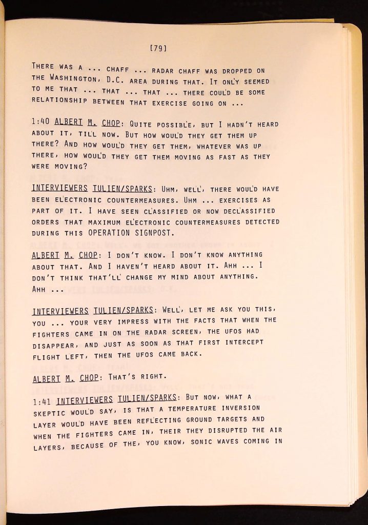 UFOs B4F1I1 Box 4 Folder 1. UFO Interview and Documentary Transcripts Item 1. Transcript of Video Interview with Albert M. Chop 1999