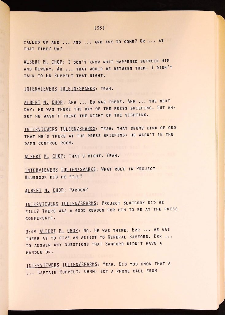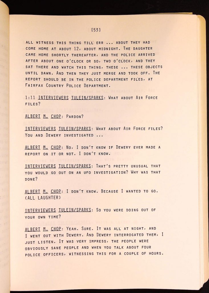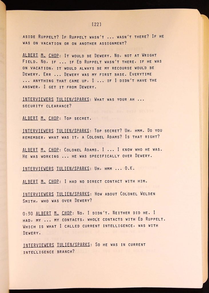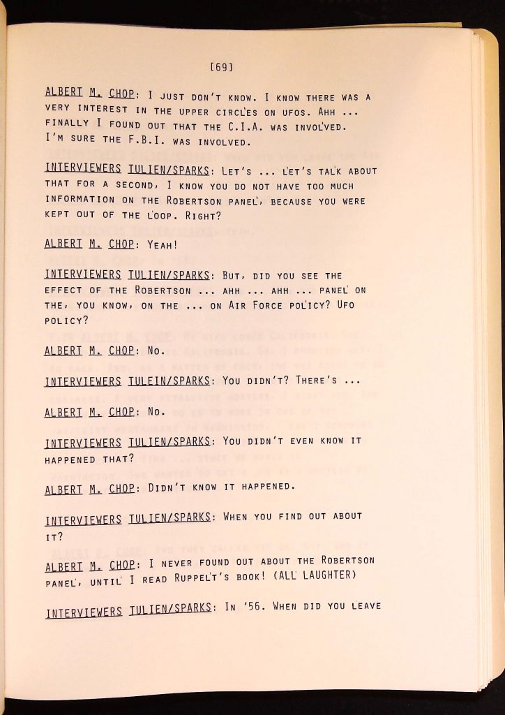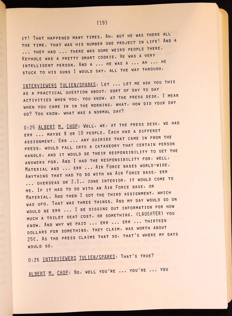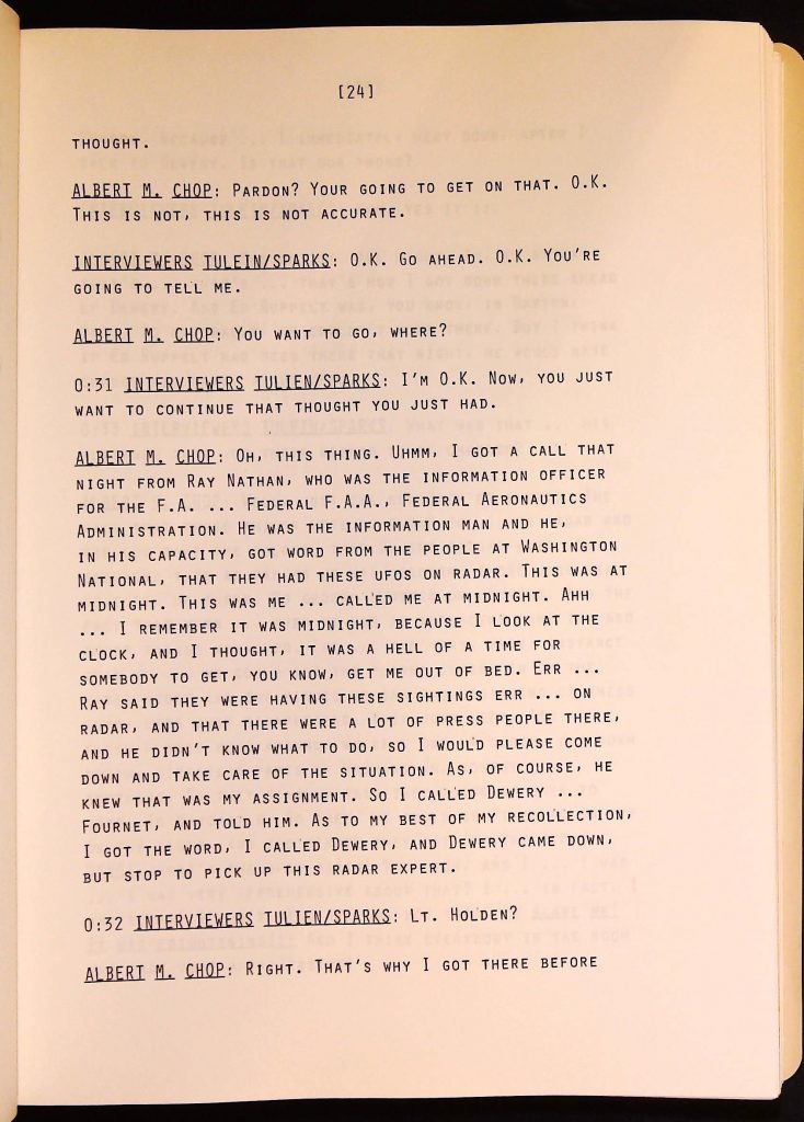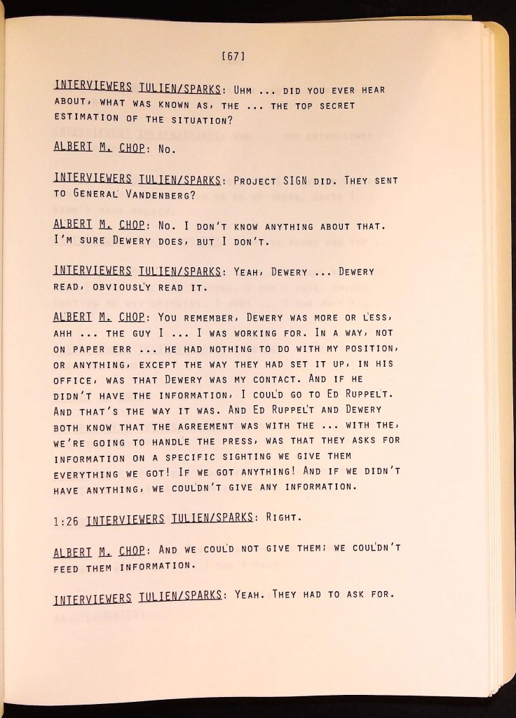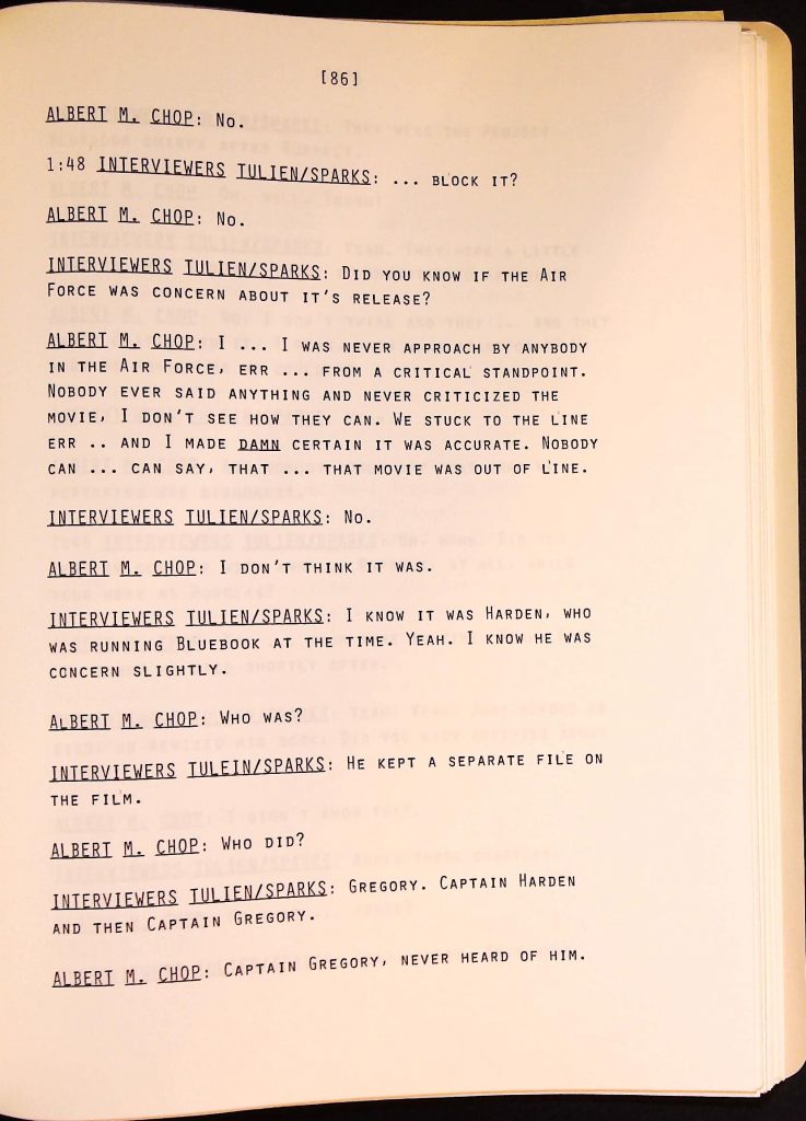 UFOs B4F1I1 Box 4 Folder 1. UFO Interview and Documentary Transcripts Item 1. Transcript of Video Interview with Albert M. Chop 1999
