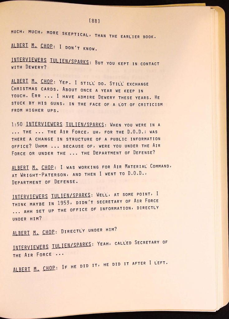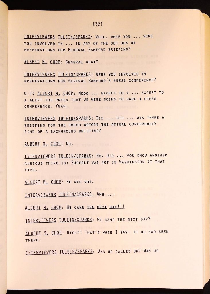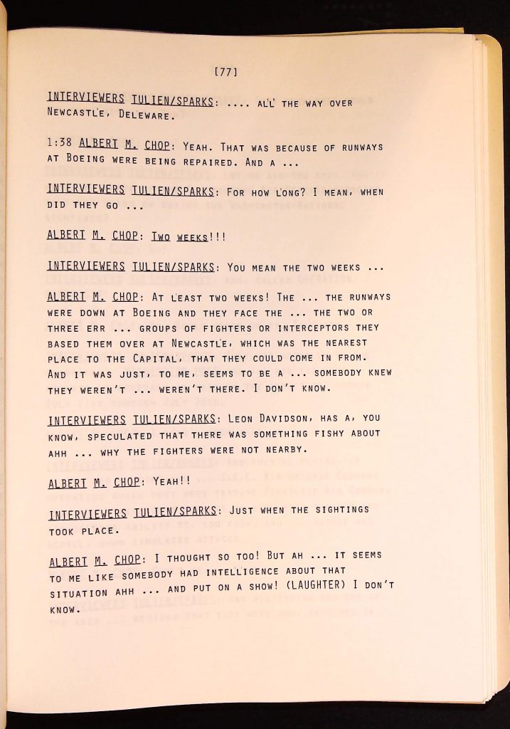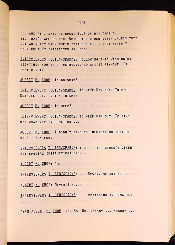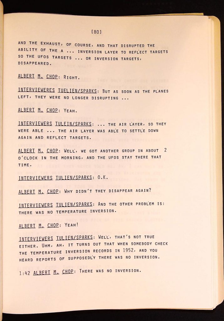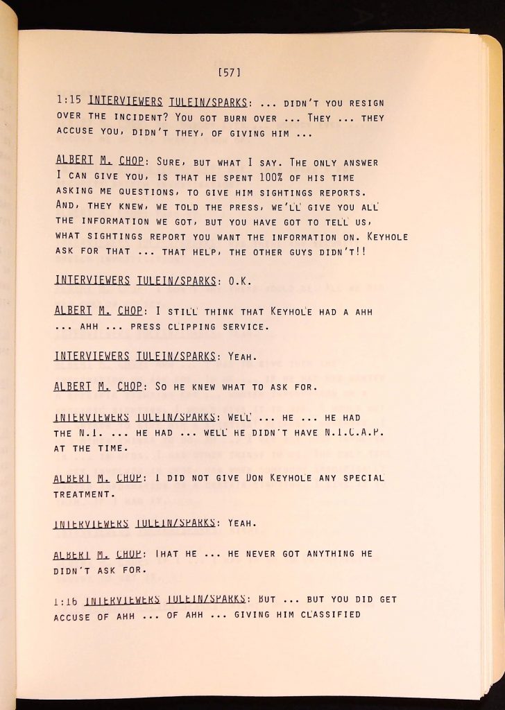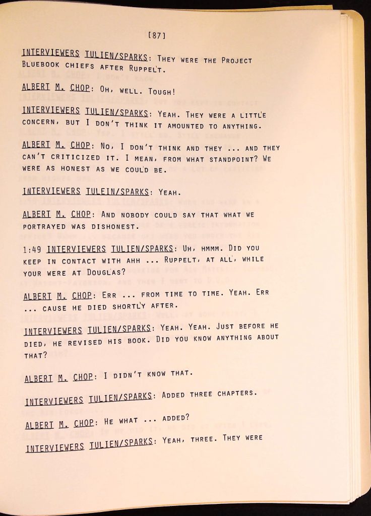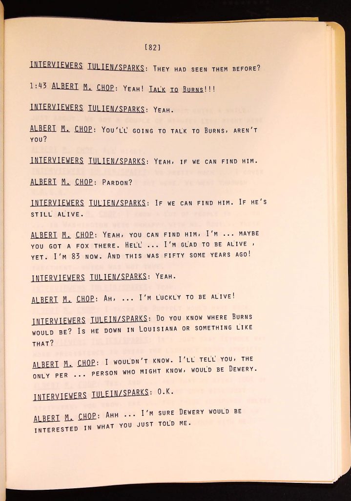 UFOs B4F1I1 Box 4 Folder 1. UFO Interview and Documentary Transcripts Item 1. Transcript of Video Interview with Albert M. Chop 1999