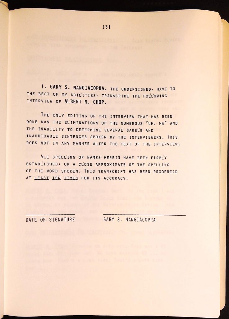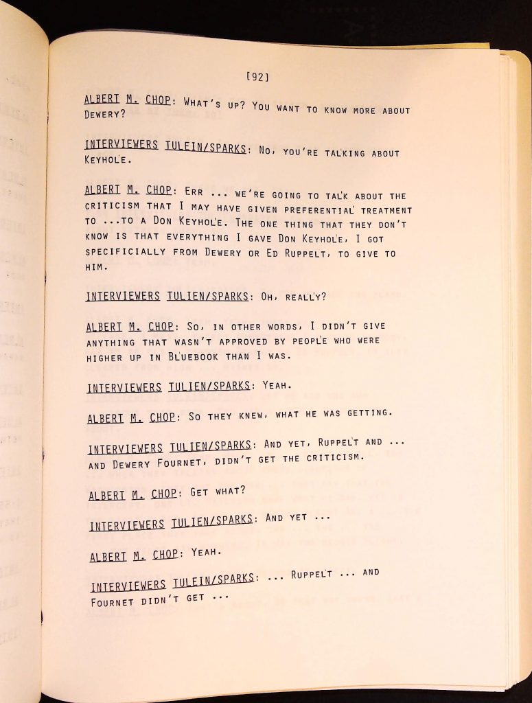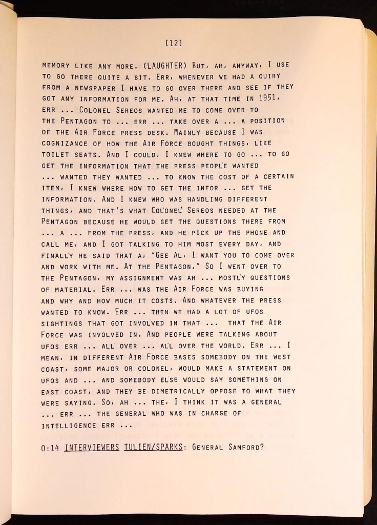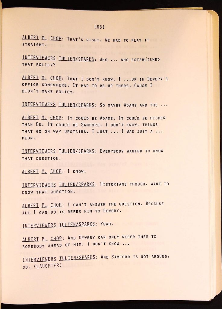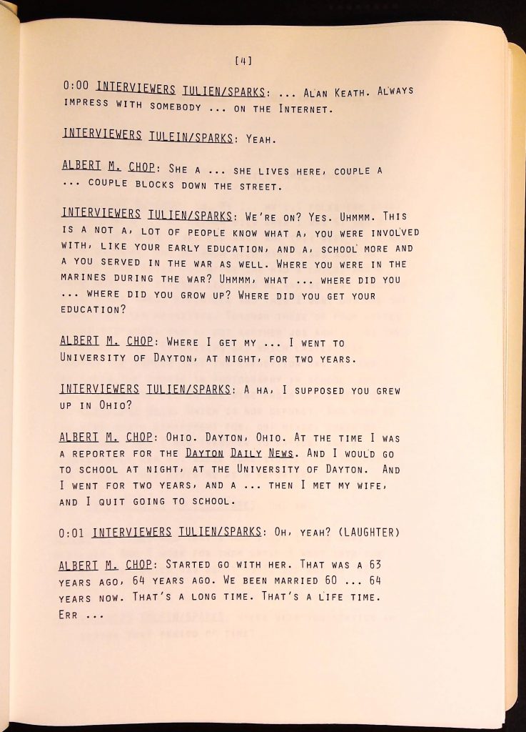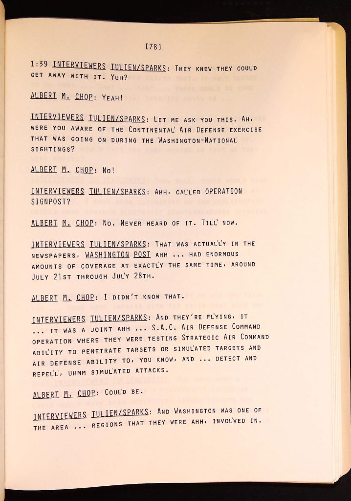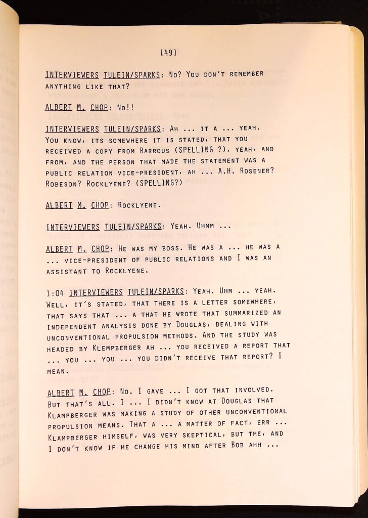 UFOs B4F1I1 Box 4 Folder 1. UFO Interview and Documentary Transcripts Item 1. Transcript of Video Interview with Albert M. Chop 1999