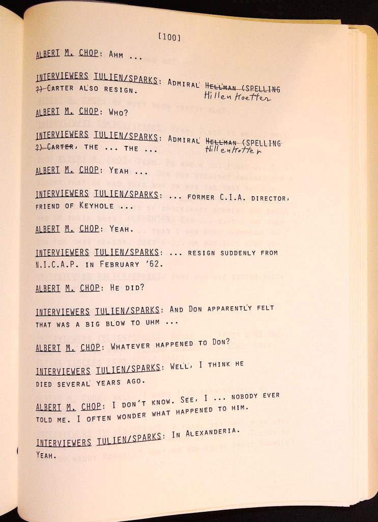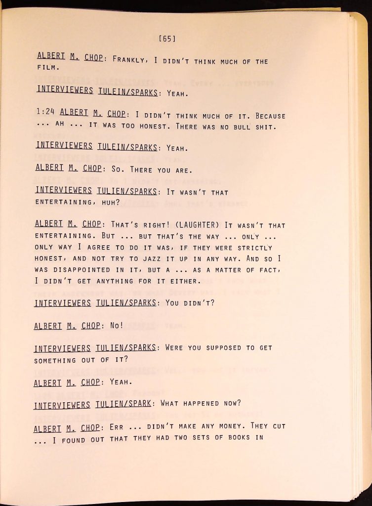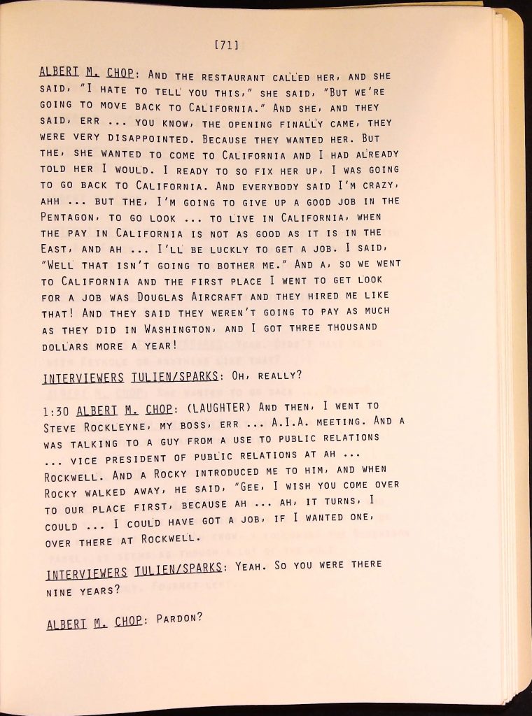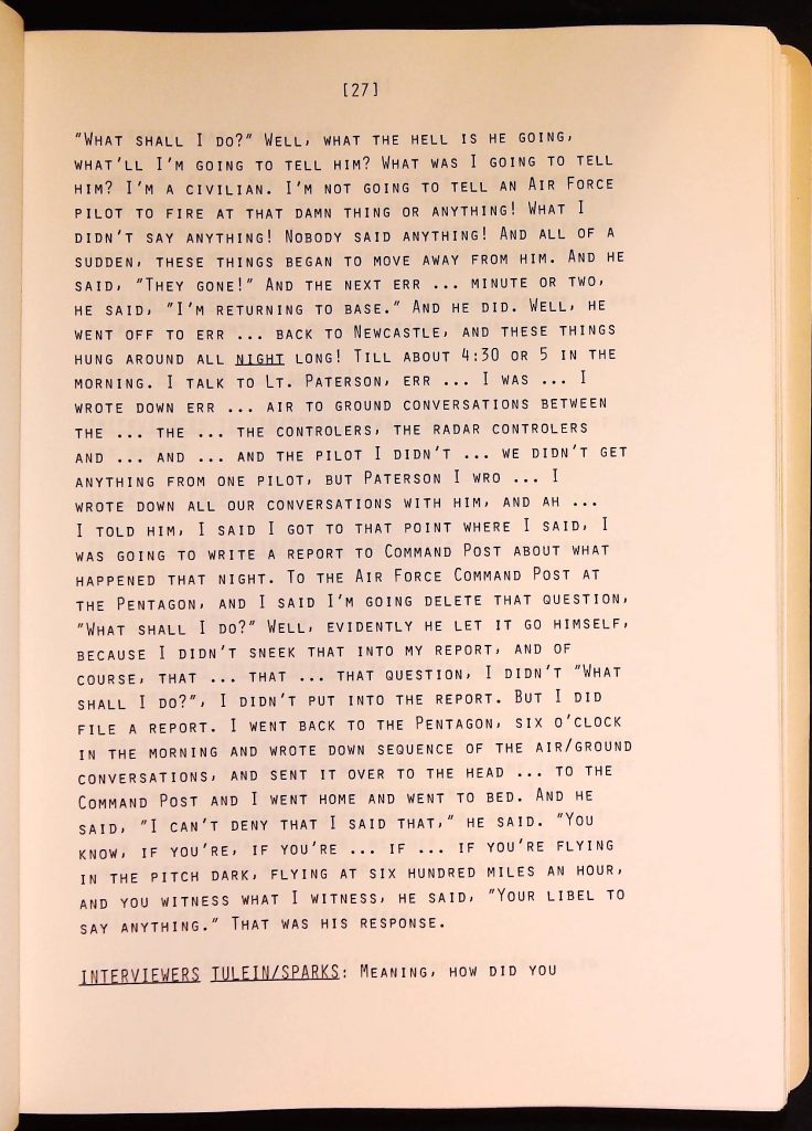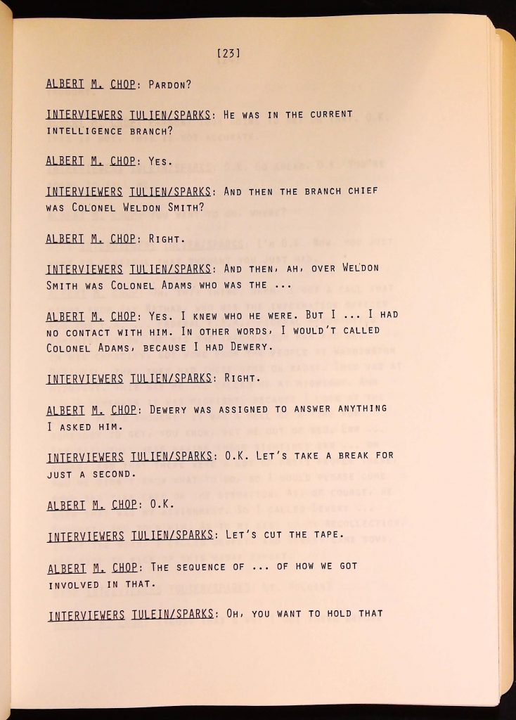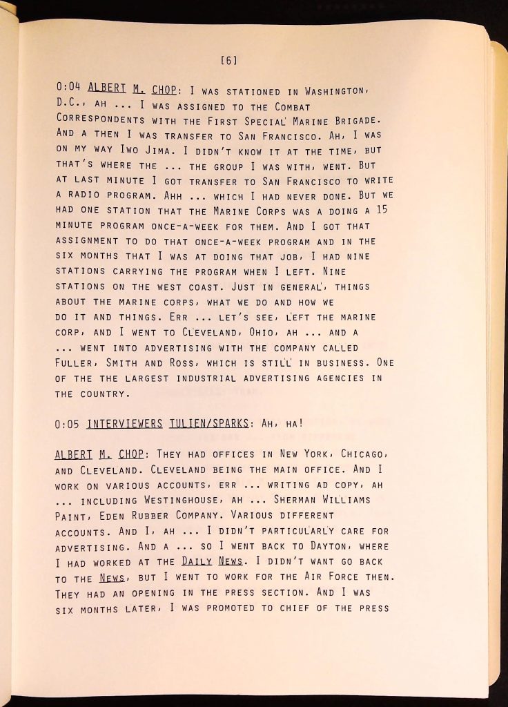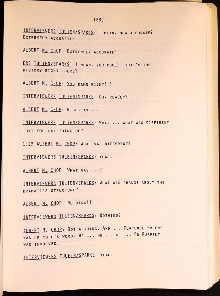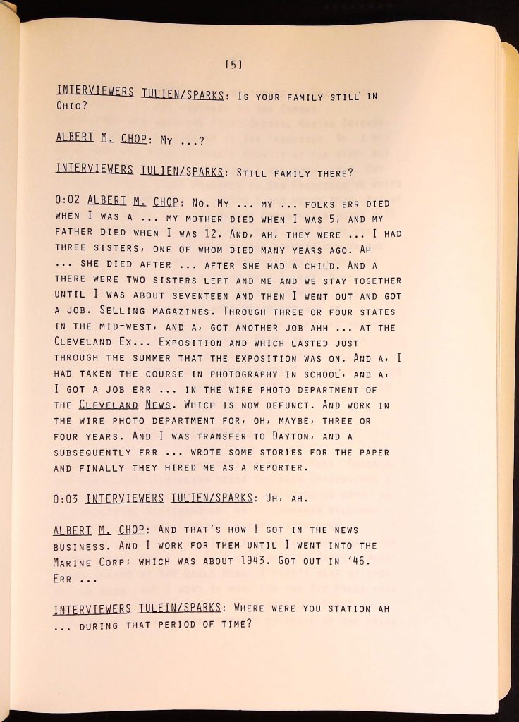 UFOs B4F1I1 Box 4 Folder 1. UFO Interview and Documentary Transcripts Item 1. Transcript of Video Interview with Albert M. Chop 1999
