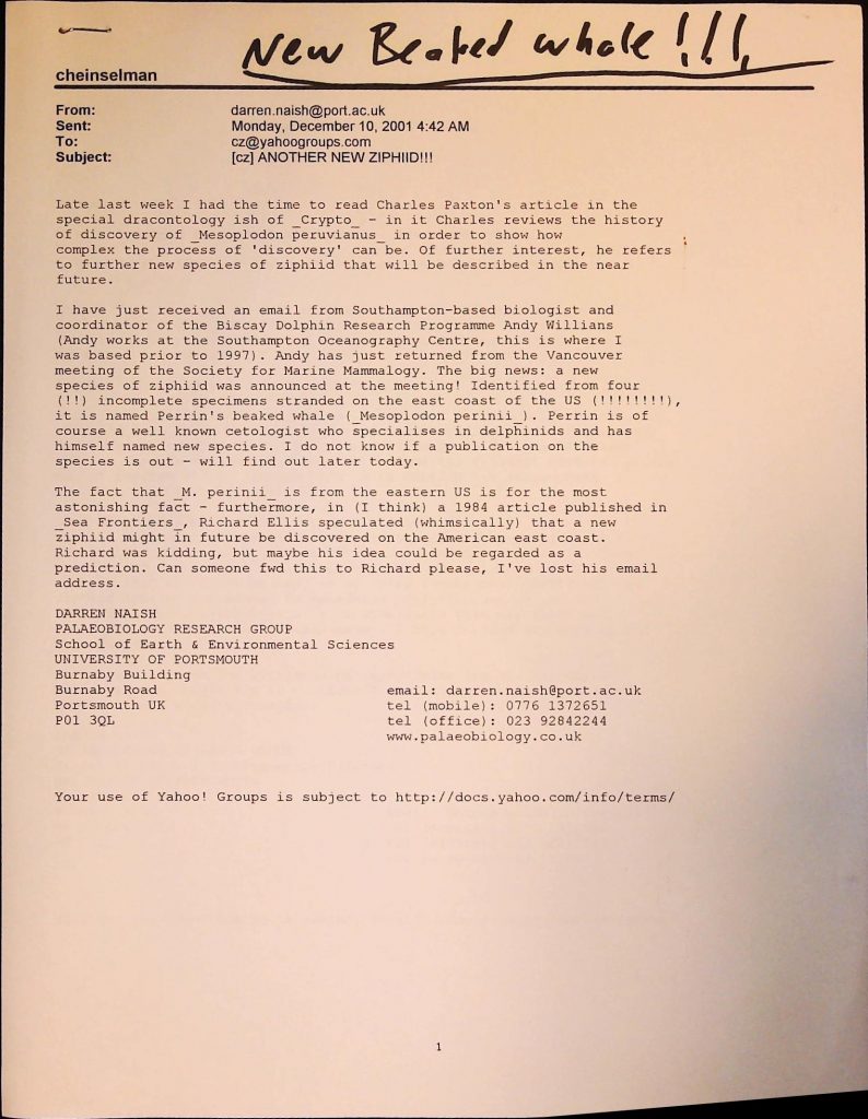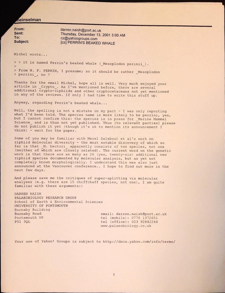 Cryptozoology B4F47I3 Box 4 Folder 47. Cryptid Whales Beaked Whale Meso Dlodon SP Item 3. Correspondence