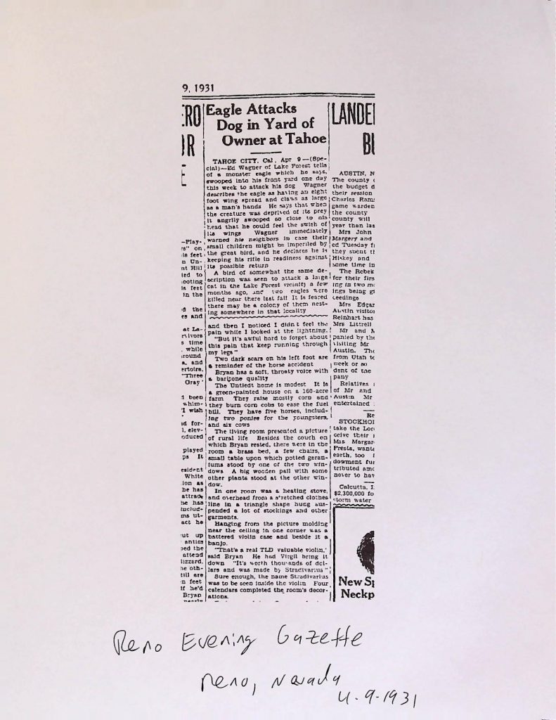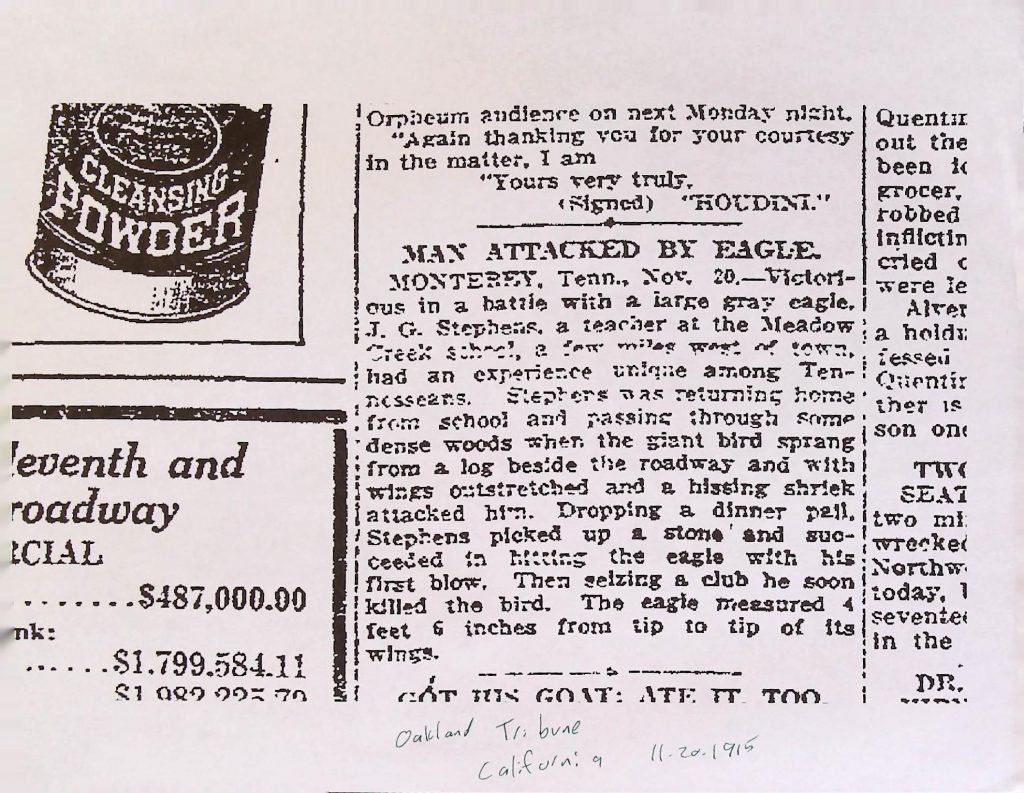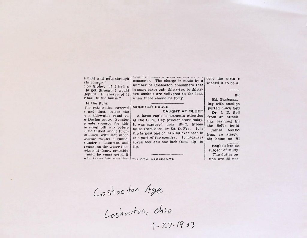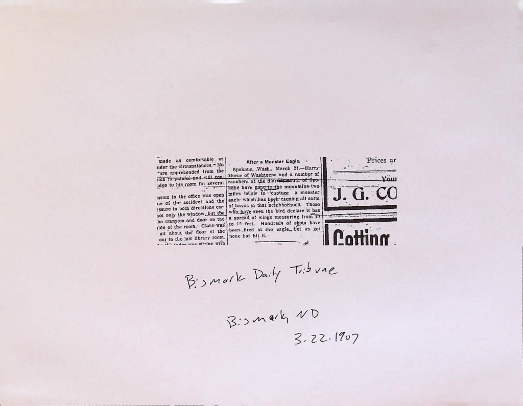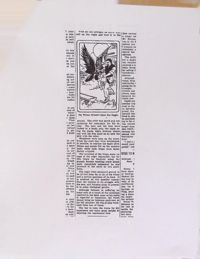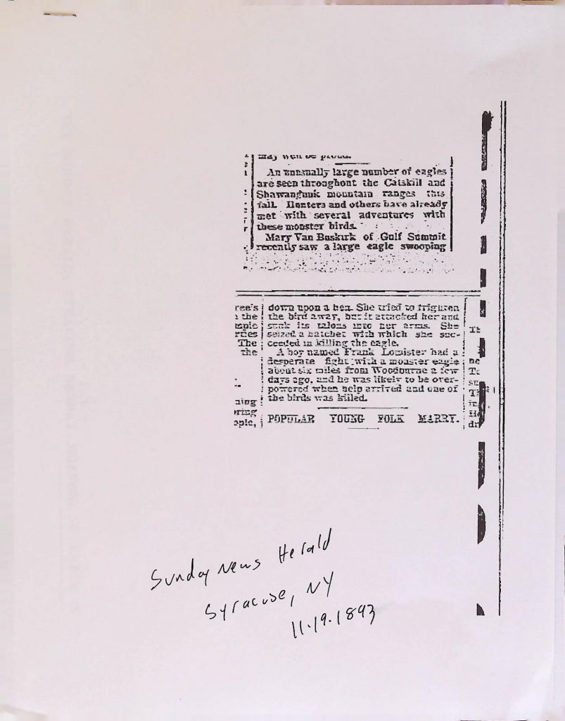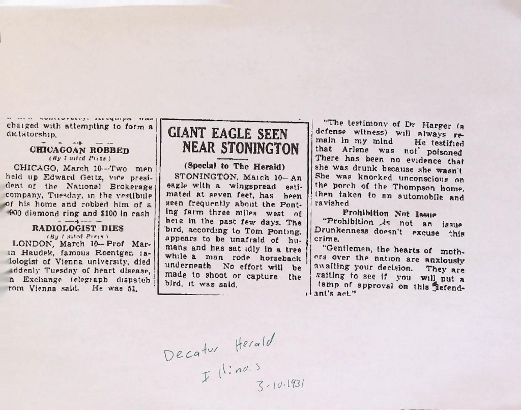 Clairvoyance - Cryptobotany - Cryptozoology - Ghost Stories - UFOs - Wildmen B7F35I1 Box 7 Folder 35. Monster Eagles Item 1. Newspaper Clippings