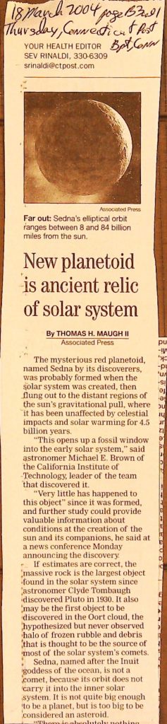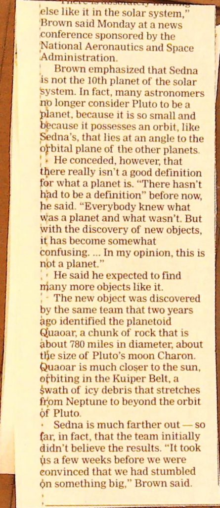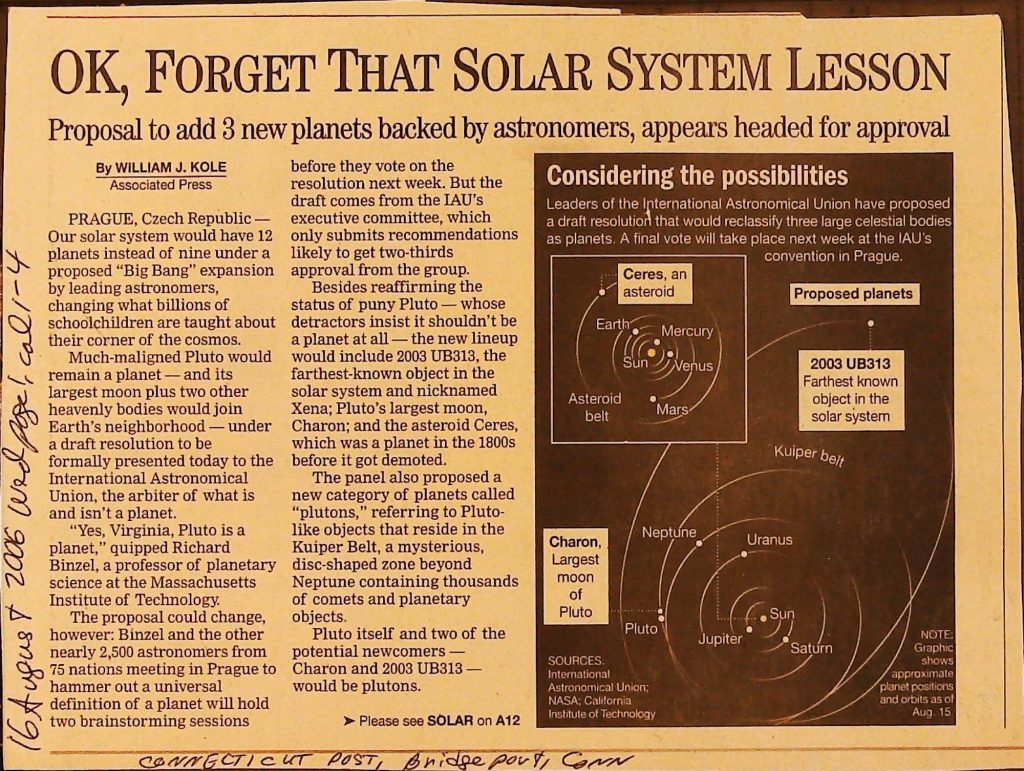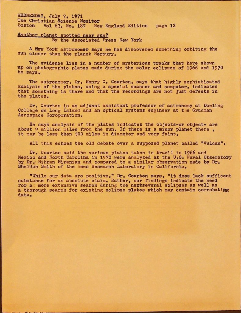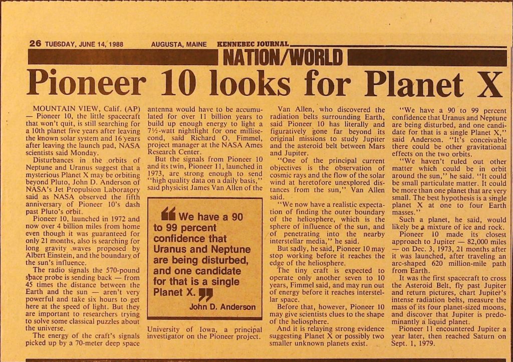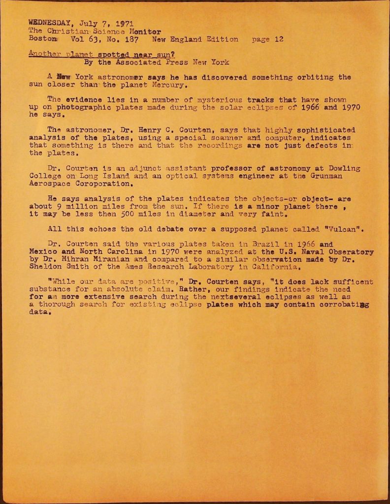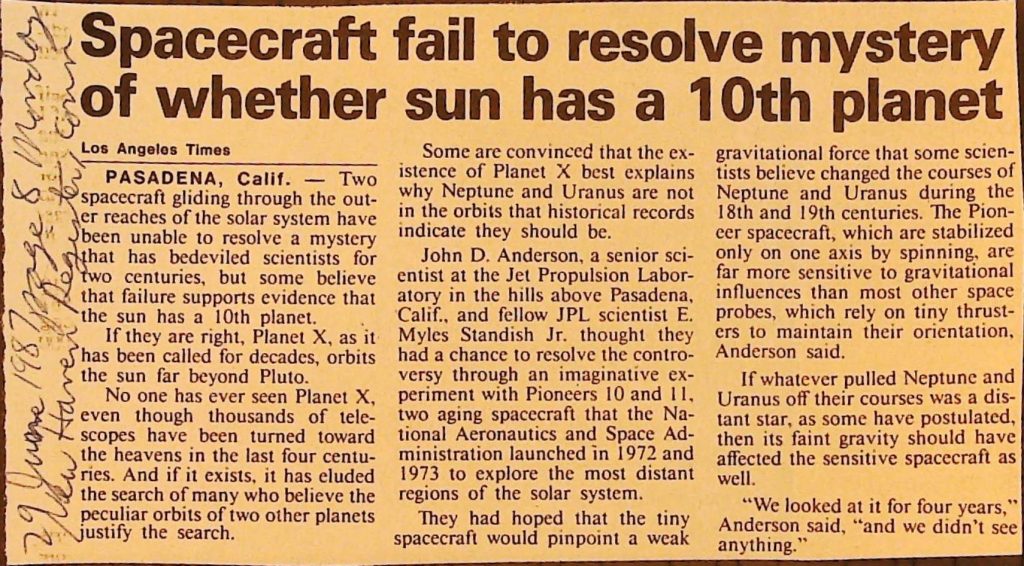 Natural Mysteries B9F25I1 Box 9 Folder 25. Planet X – 10th Planet Intermercury Planet Item 1. Newspaper Articles