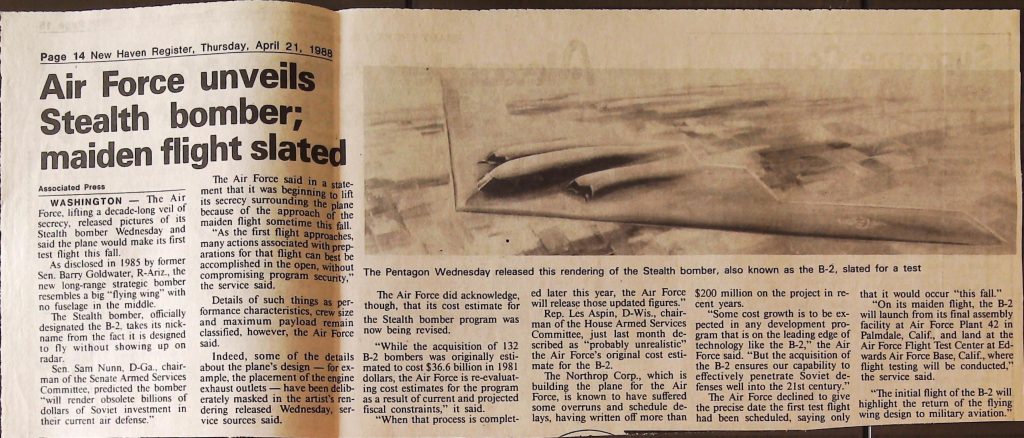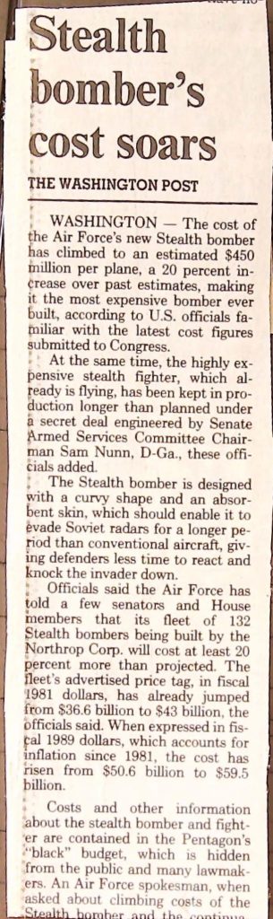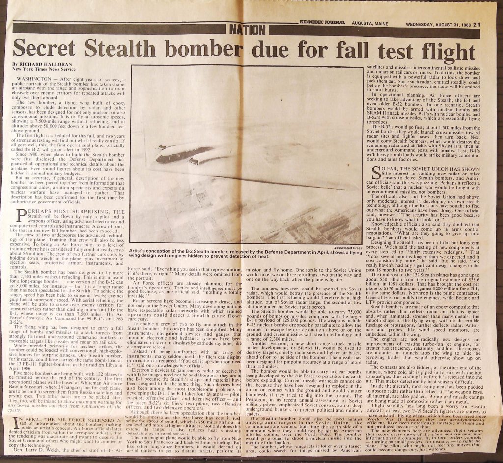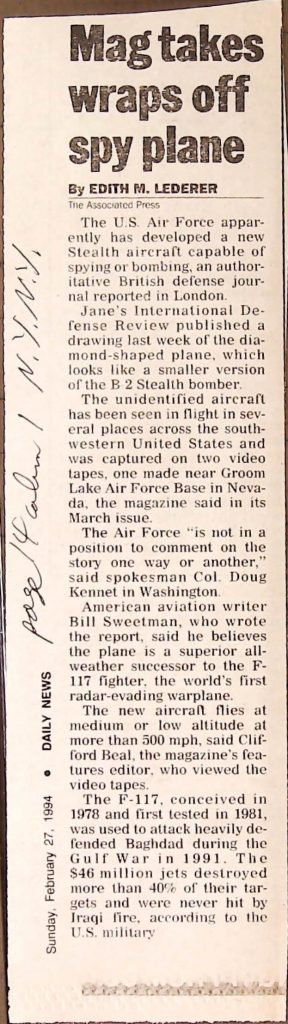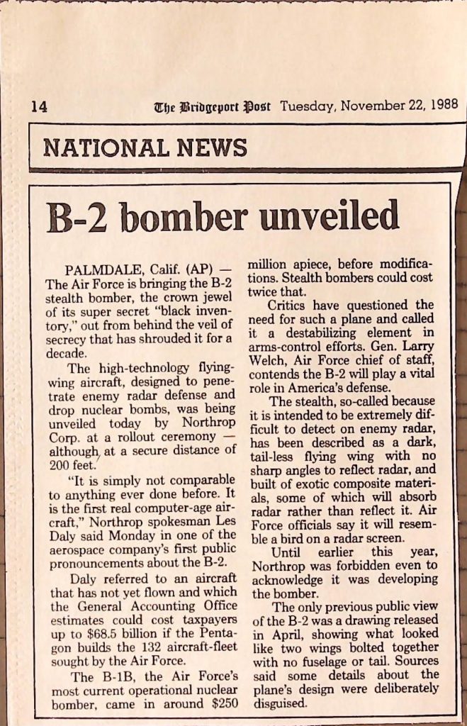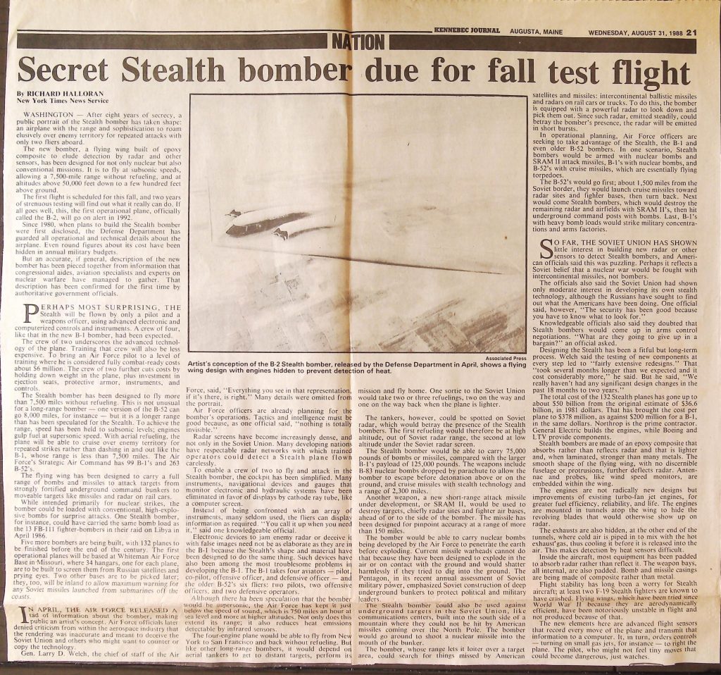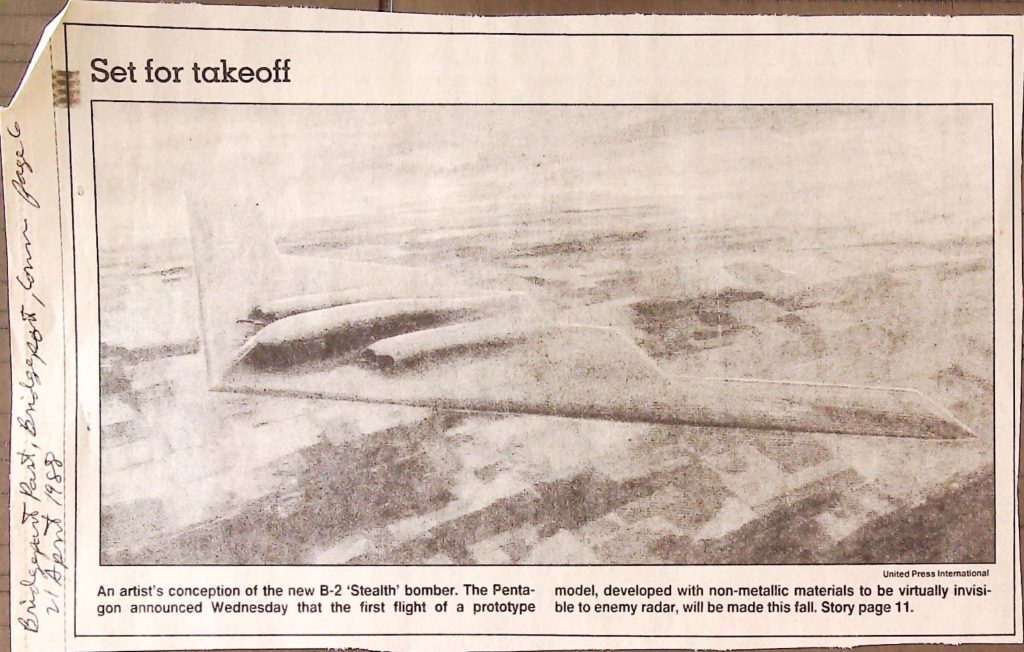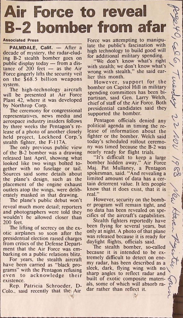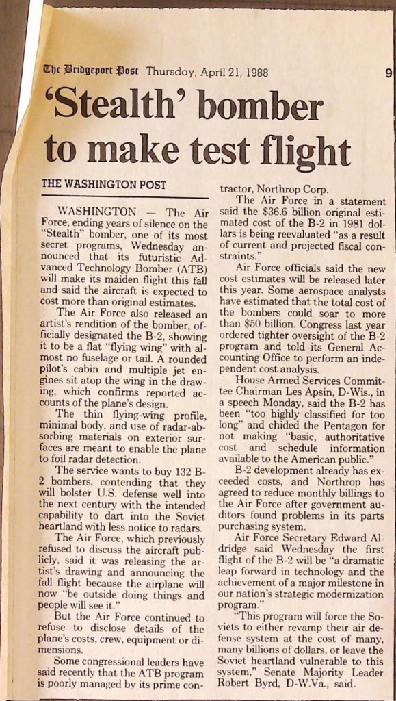 Uncategorized B9F34I1 Box 9 Folder 34. Stealth Bomber Secret Experimental Aircraft Item 1. Newspaper Articles