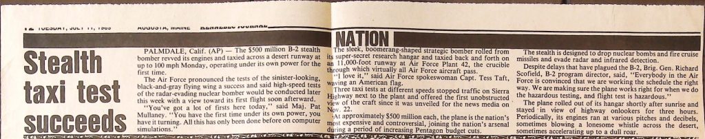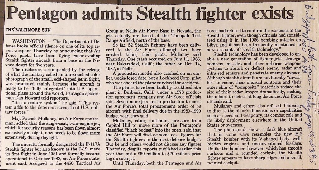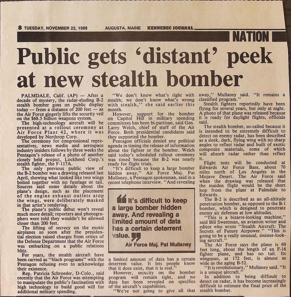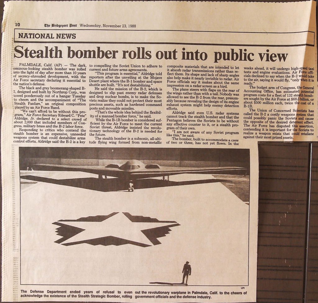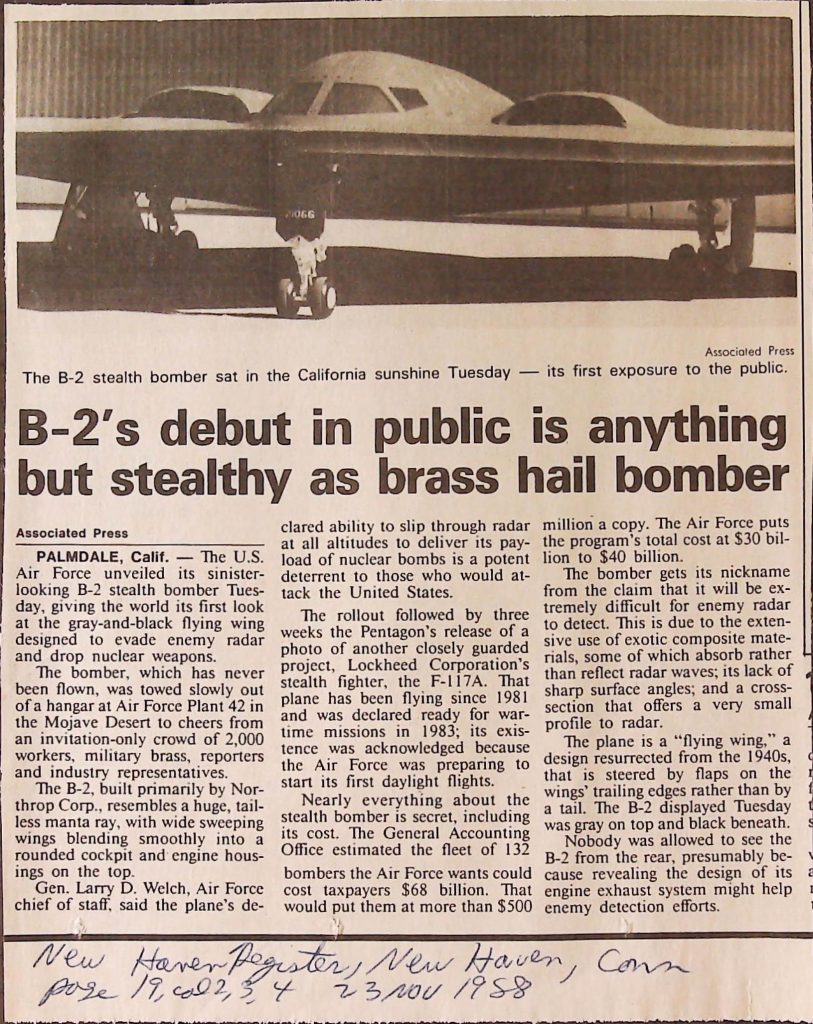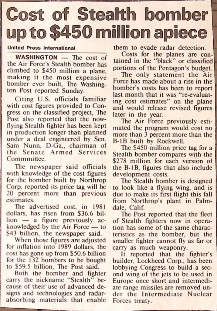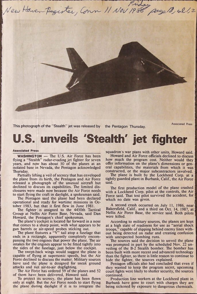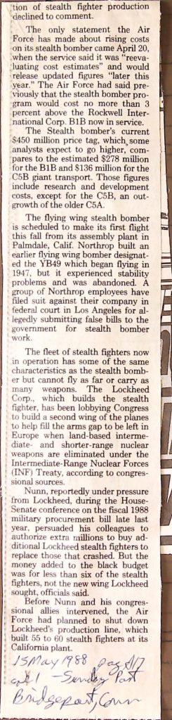 Uncategorized B9F34I1 Box 9 Folder 34. Stealth Bomber Secret Experimental Aircraft Item 1. Newspaper Articles