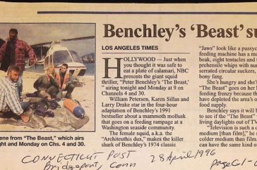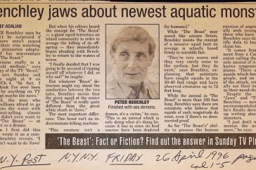 Box 6 Folder 11: Benchley’s Peter – Jaws – Sharks Item 9. News Article – Benchley’s Beast Surfaces Tonight